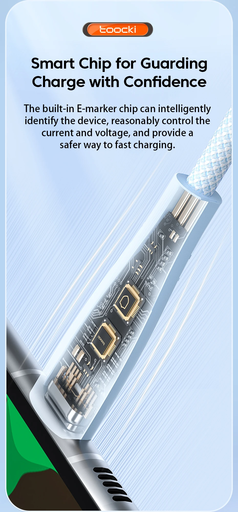 El chip E-marcador incorporado puede identificar inteligentemente el dispositivo, controlar razonablemente la corriente y el voltaje, y proporcionar una forma más segura de carga rápida.