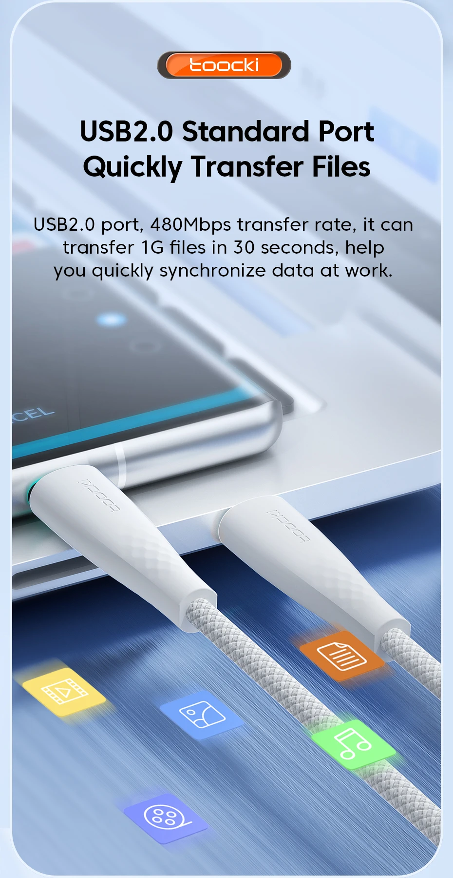 Puerto USB2.0, tasa de transferencia de 480Mbps, puede transferir archivos 1G en 30 segundos, lo ayuda a sincronizar rápidamente los datos en el trabajo.