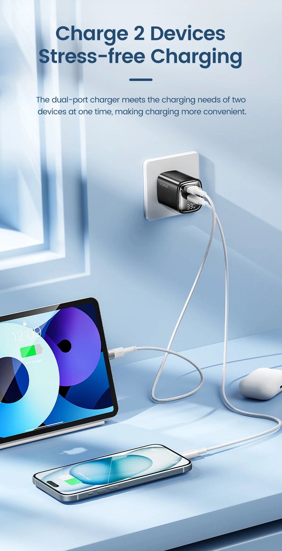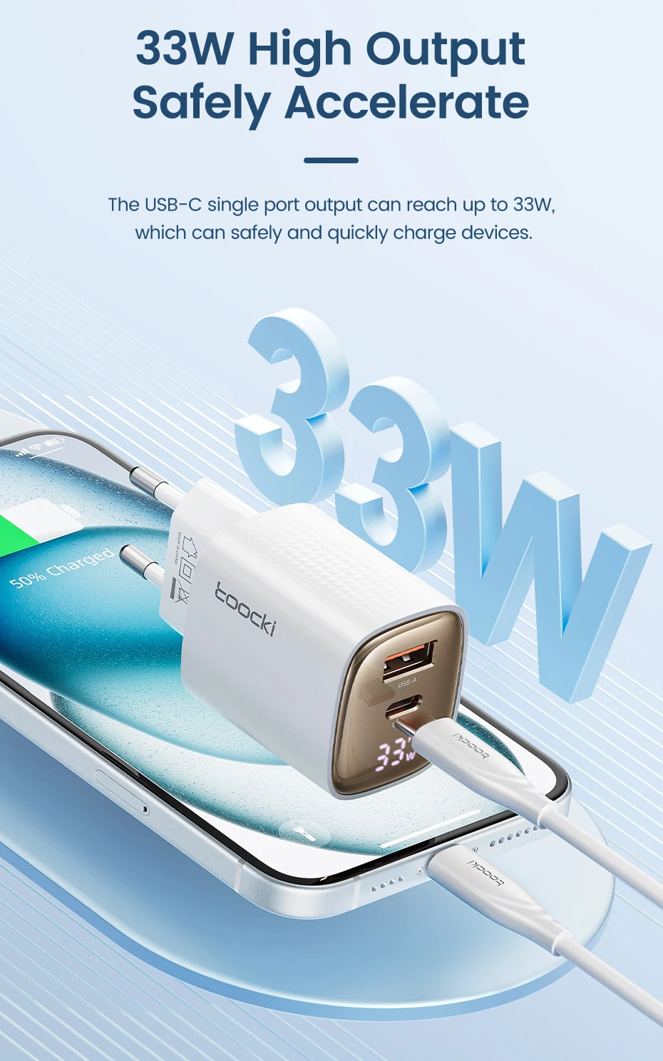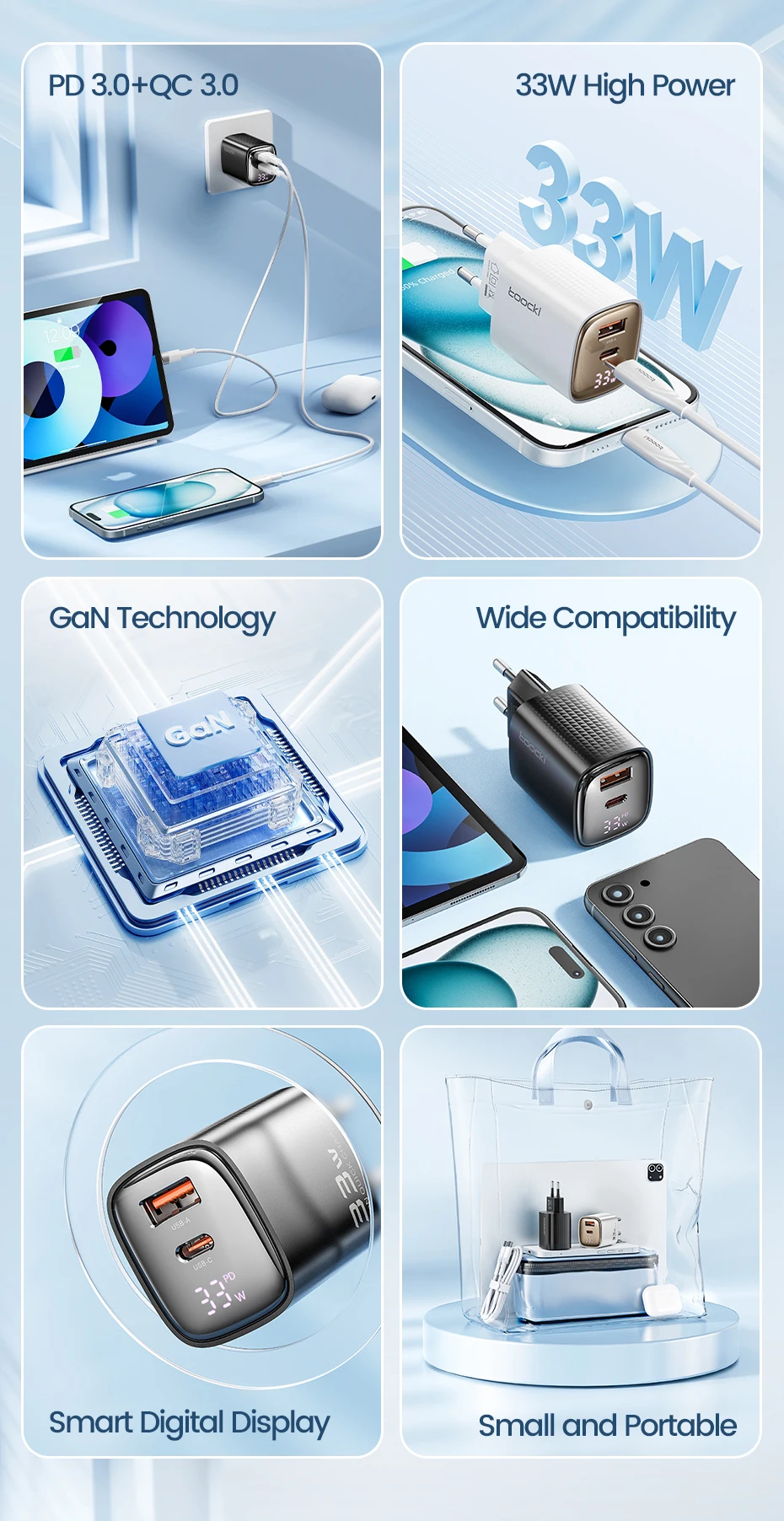 • Carga rápida :El cargador Tookki 33W gan USB C ofrece una carga rápida y eficiente, ideal para reponer la energía de tus dispositivos en poco tiempo.