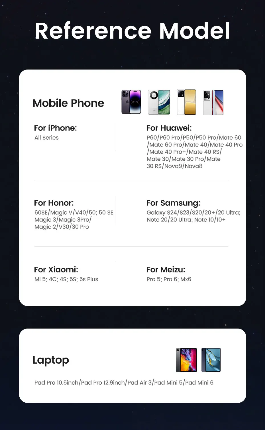 Para Huawei: p60/P60 Pro/P50/P50 Pro/Mate 60/Mate 60 Pro/Mate 40/Mate 40 Pro/Mate 40 Pro +/Mate 40 RS/Mate 30/Mate 30 Pro/mate 30 RS/Nova9/Nova8