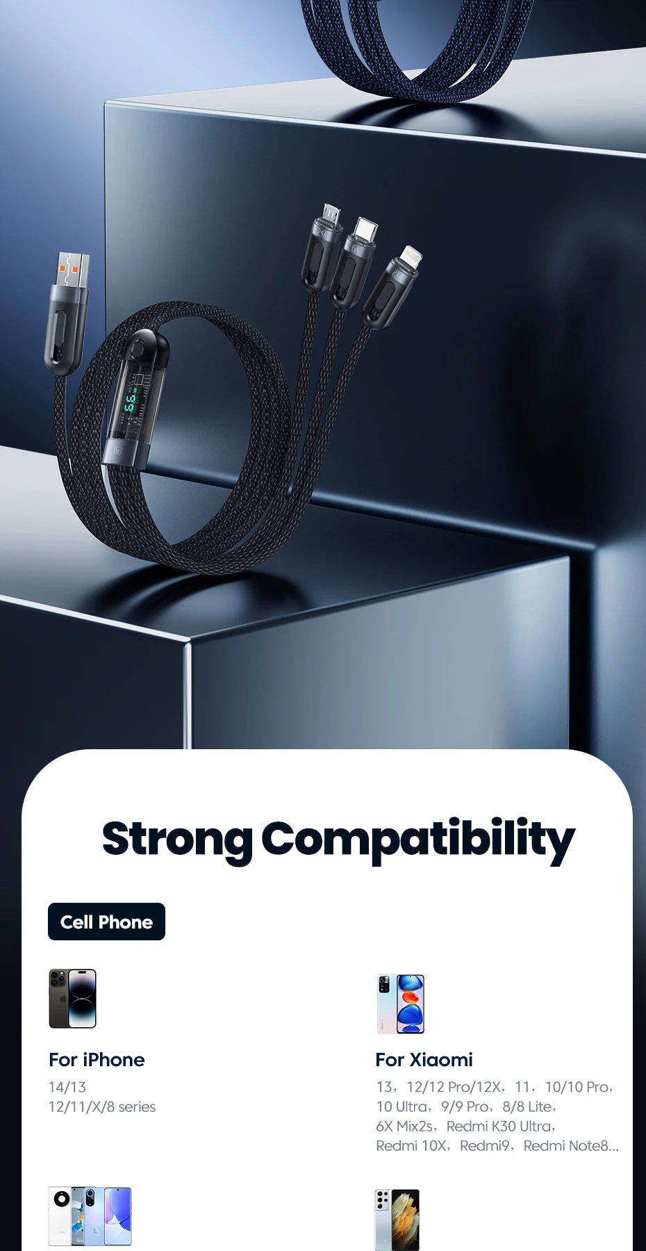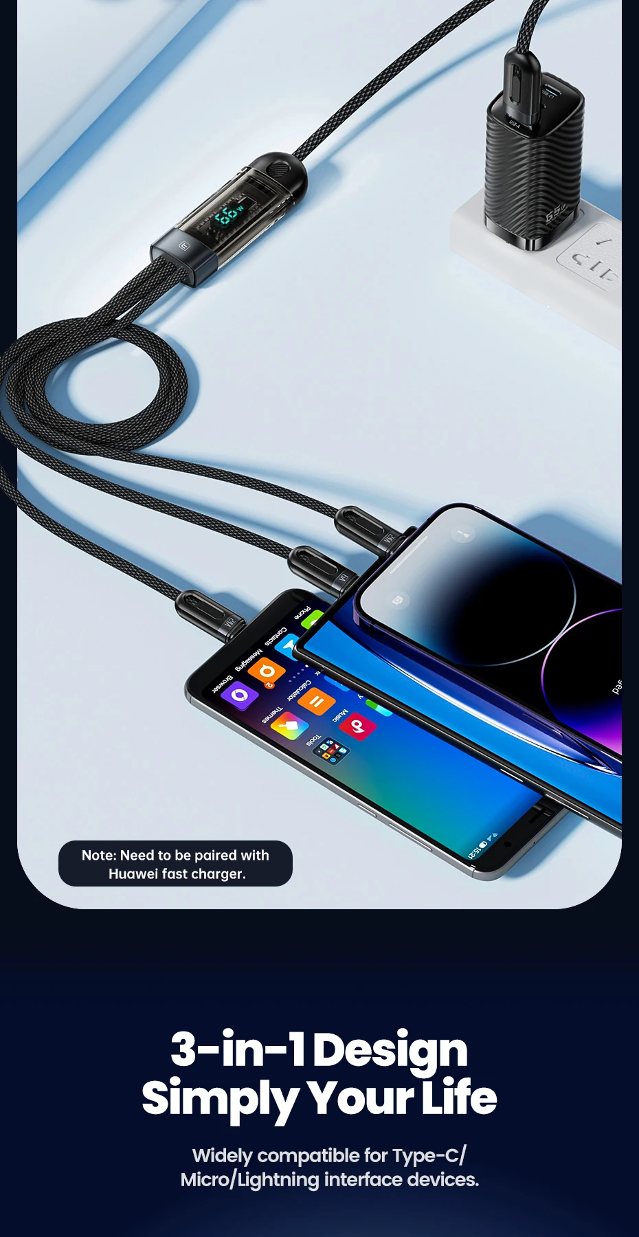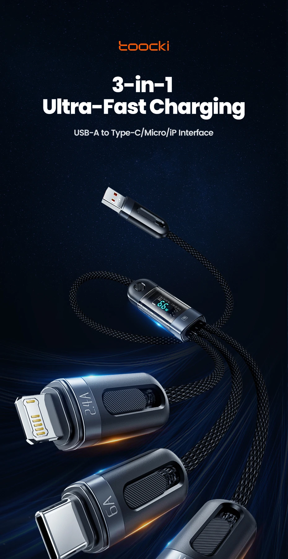 Toocki 66W 3 en 1 Cable USB Micro USB tipo C Cable de pantalla Digital para iPhone 15 14