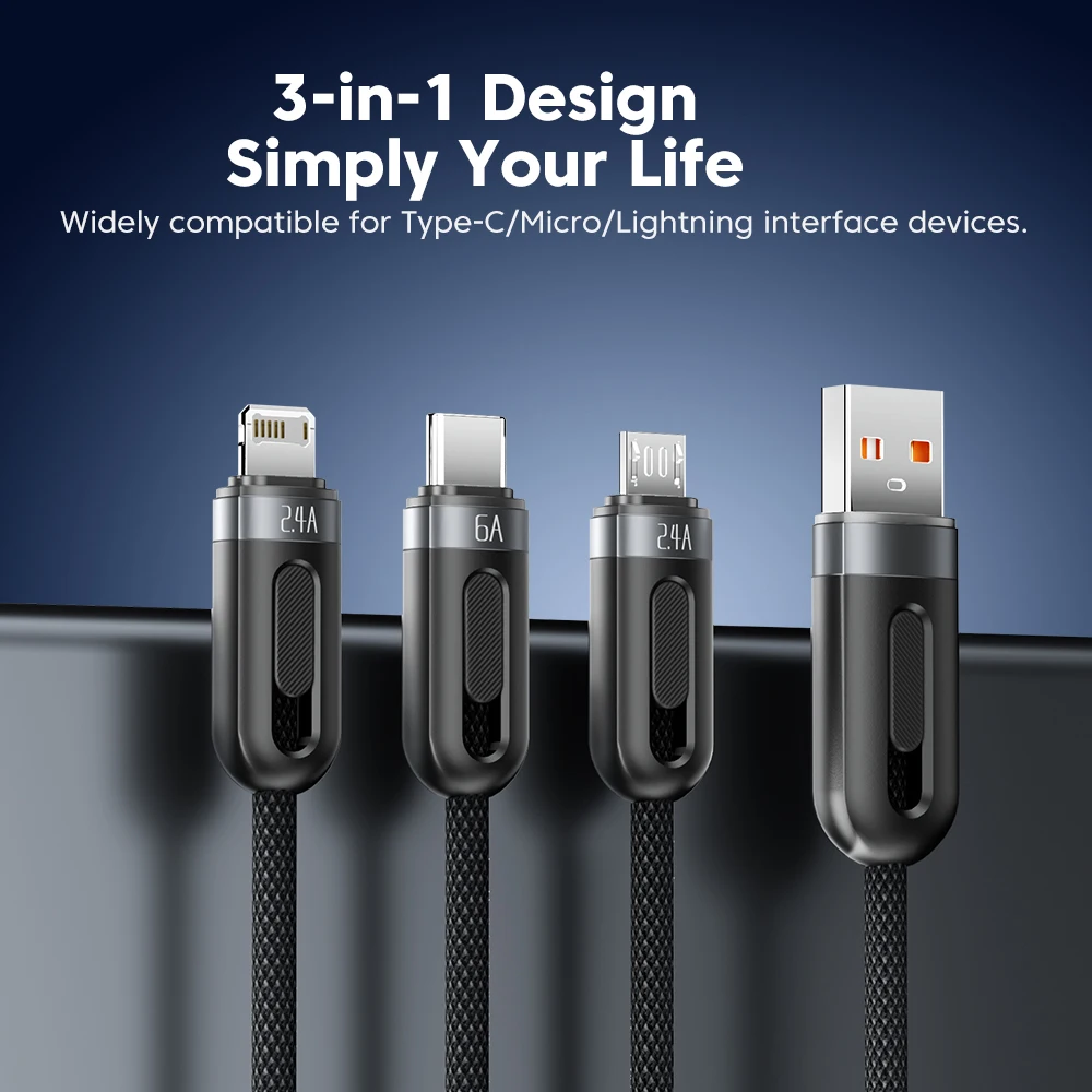 Comprar Toocki 66W 3 en 1 Cable USB 6A carga rápida pantalla Digital transparente Cable tipo C para Huawei P60 P50 P40 P30 para iPhone 15