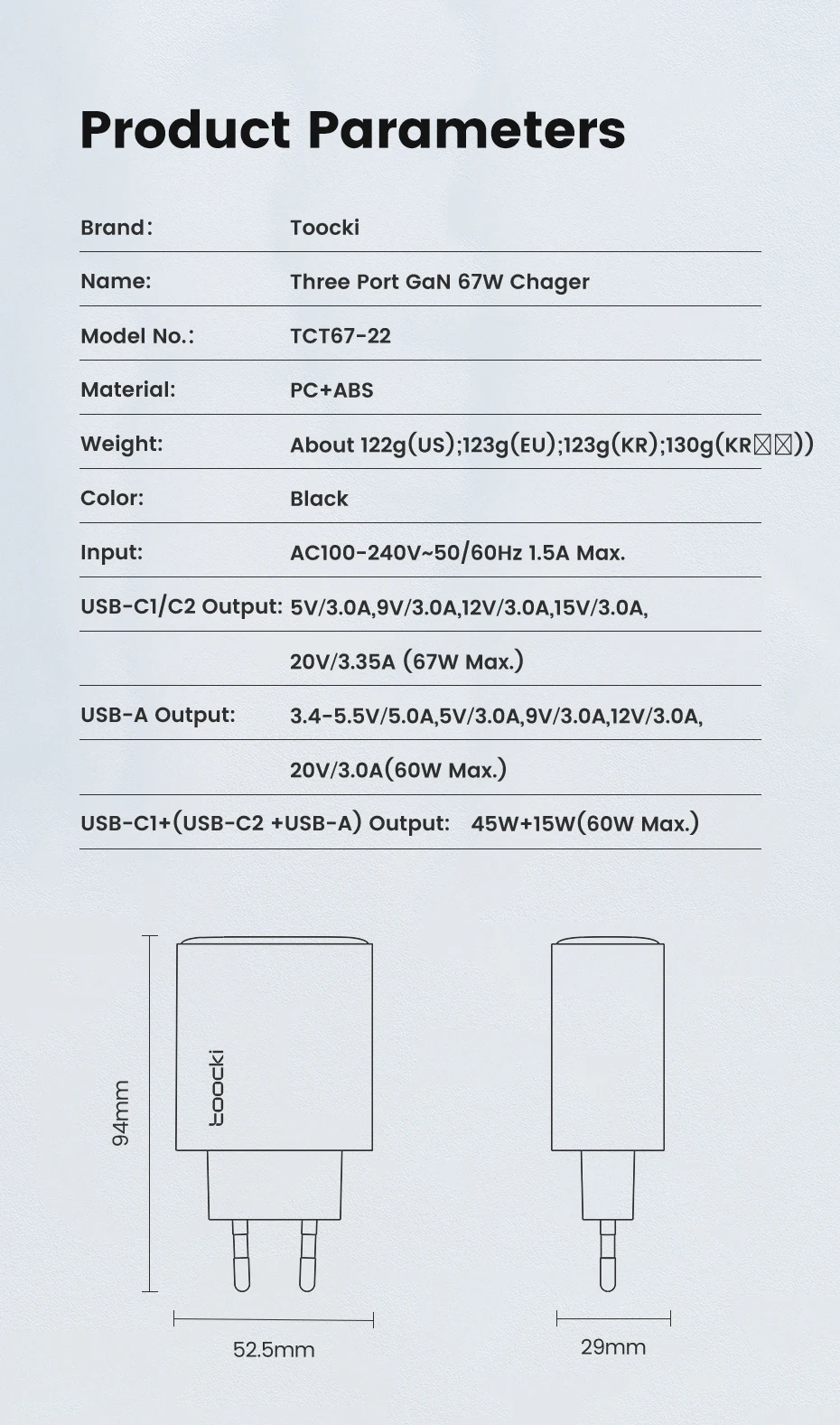 La salida máxima es de 67 W, que puede recargar rápidamente dispositivos electrónicos como computadoras portátiles/teléfonos inteligentes.