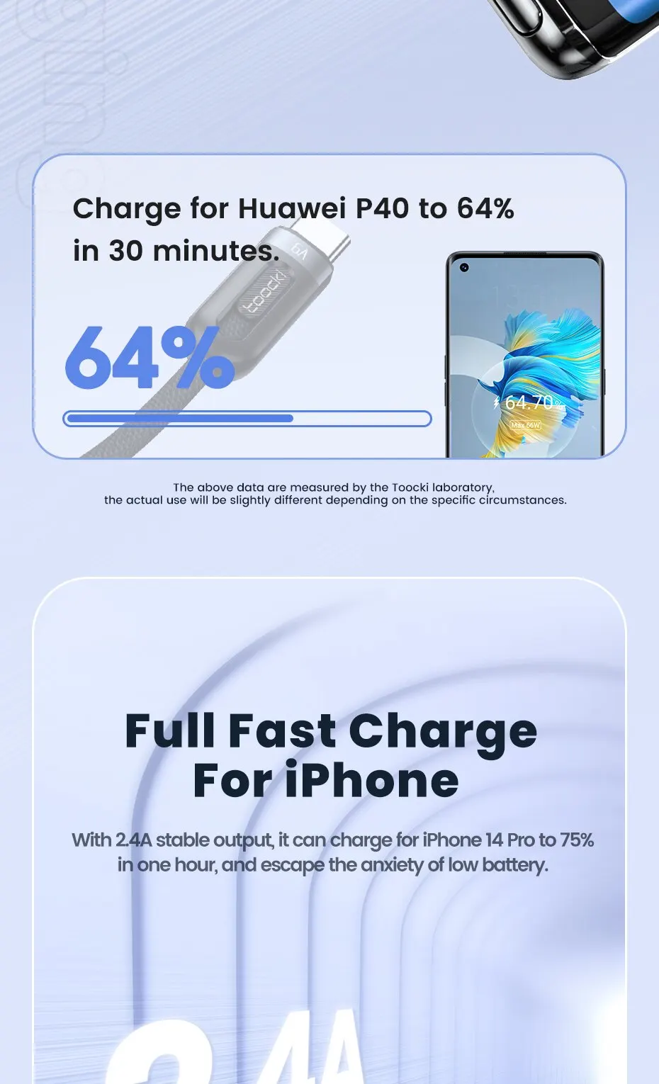 Admite modelos TURBO de carga súper rápida de 100 W de Huawei: Huawei nova 10 Pro, nova 9 Pro, Honor 70 Pro+, 70 Pro, 50 Pro, etc.(requiere el uso del cargador USB-A Huawei de 100 W para lograr una carga súper rápida)