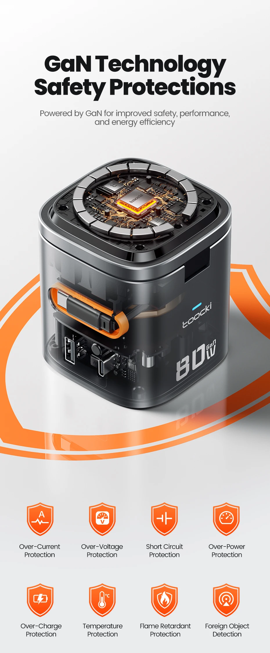 7: Tecnología GaN, múltiples protecciones de seguridad, la tecnología GaN de nueva generación mejora la eficiencia de carga y garantiza una seguridad integral: protección contra sobrecorriente, protección contra sobretensión, protección contra cortocircuitos, protección contra sobrepotencia, protección contra sobrecarga, protección de temperatura, protección retardante de llama, detección de objetos extraños