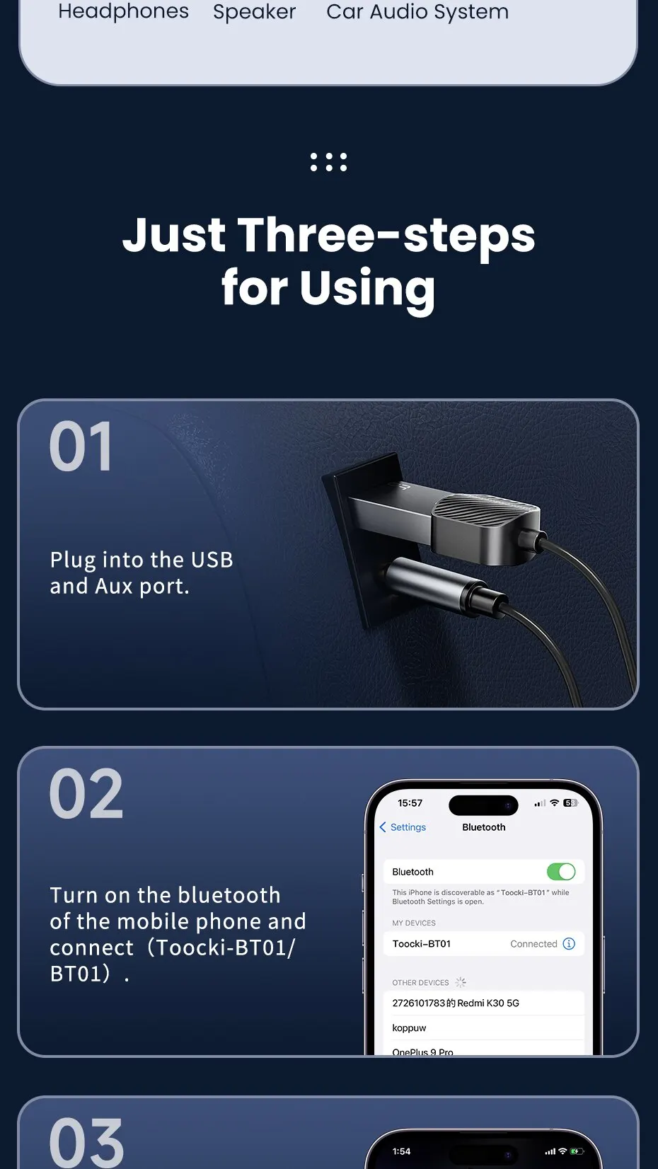 2. encienda el Bluetooth del teléfono móvil y conecte (Toocki BT01-).
