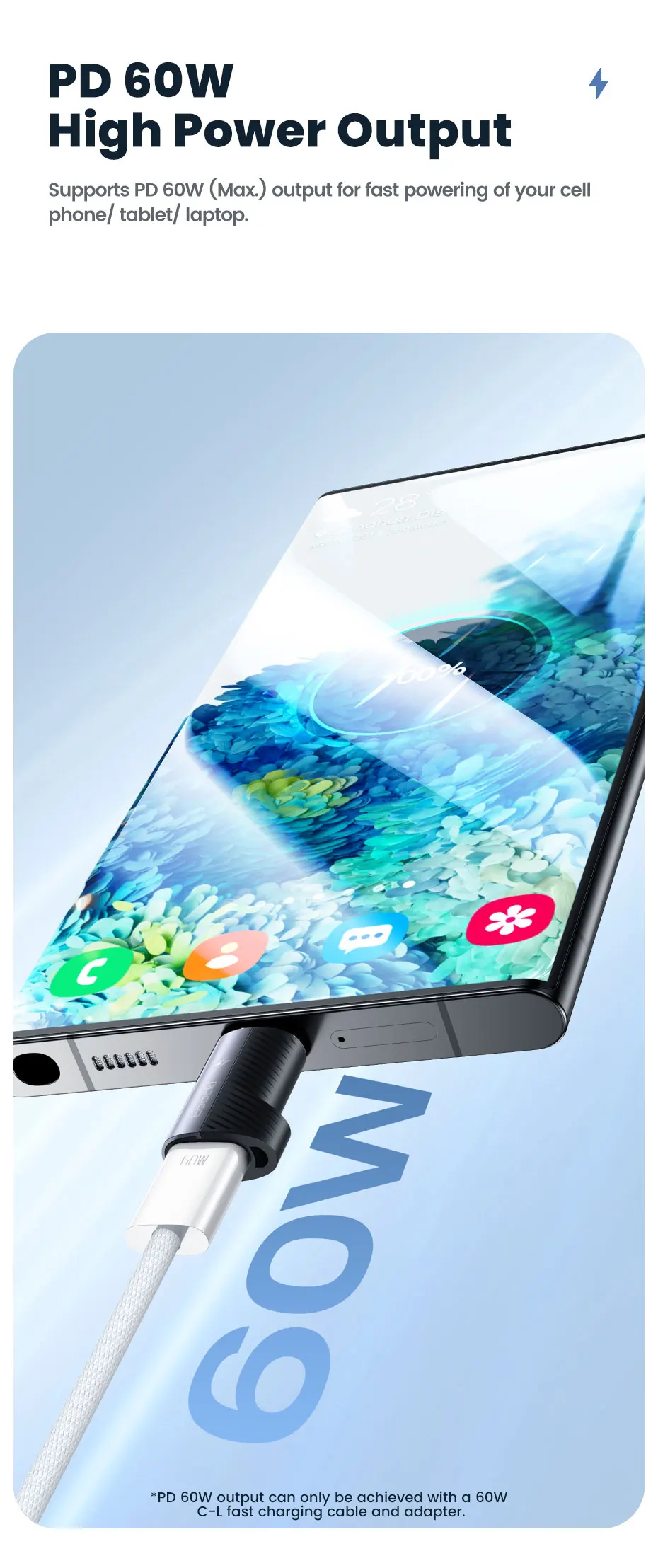 La salida PD 60W solo se puede lograr con un cable y adaptador de carga rápida C-L de 60W.