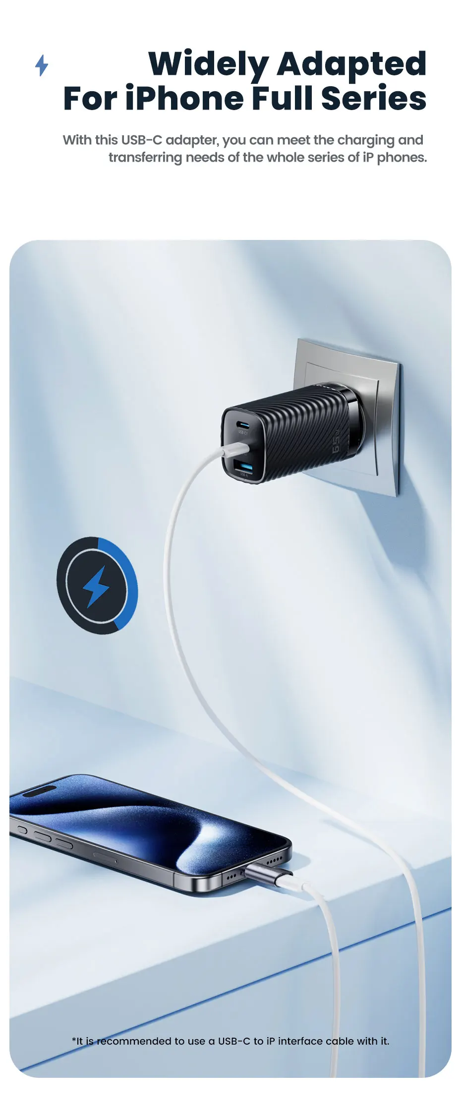 • Adaptador PD 60W :Este adaptador de alta potencia PD 60W garantiza una carga rápida y eficiente para tus dispositivos iOS y Mac, como el iPhone 15 Pro y el portátil.