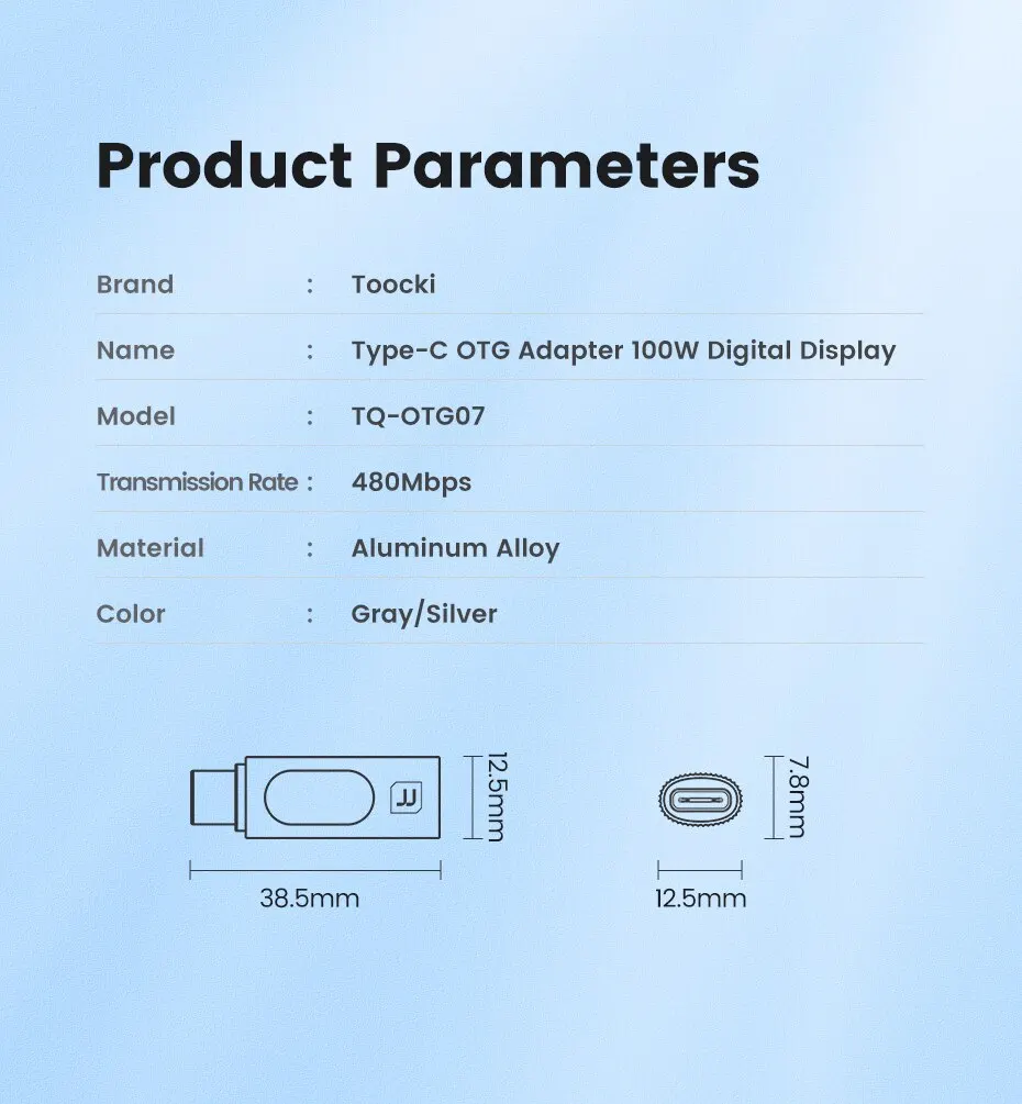 • Pantalla digital de 100W:El adaptador Toocki OTG tiene una pantalla digital de 100W que muestra el estado de carga de su dispositivo.