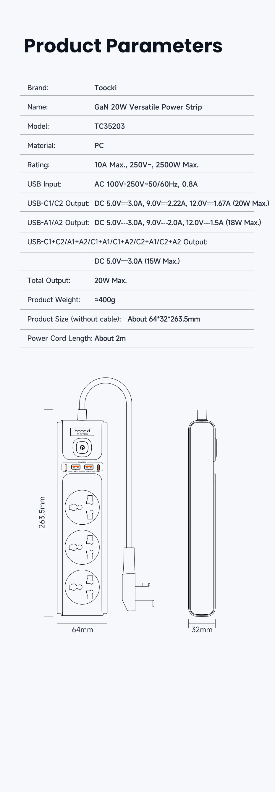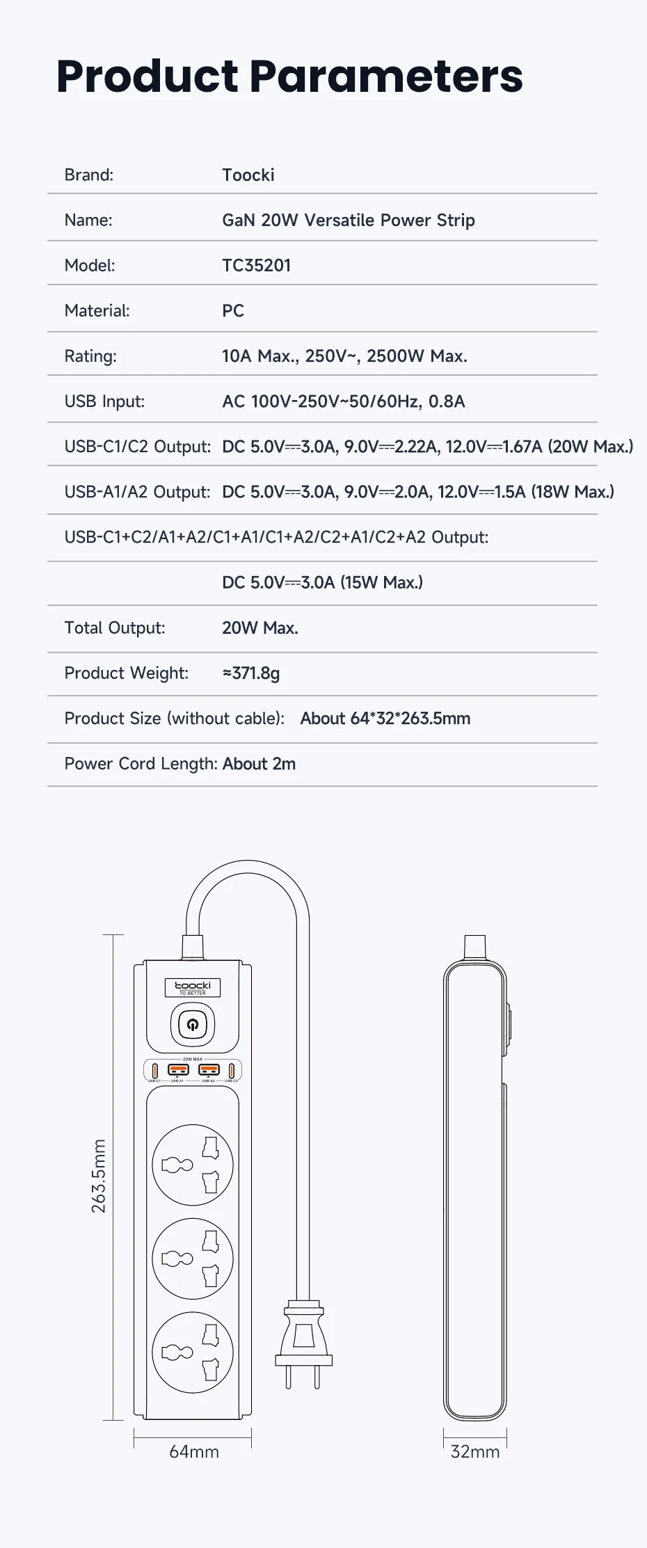 Product Dimensions (excluding power cord): Approximately 64×32×263.5mm