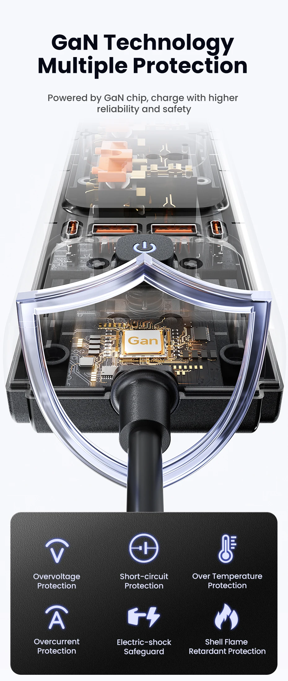 Adopts GaN (Gallium Nitride) chip for more reliable and safer charging, featuring:
