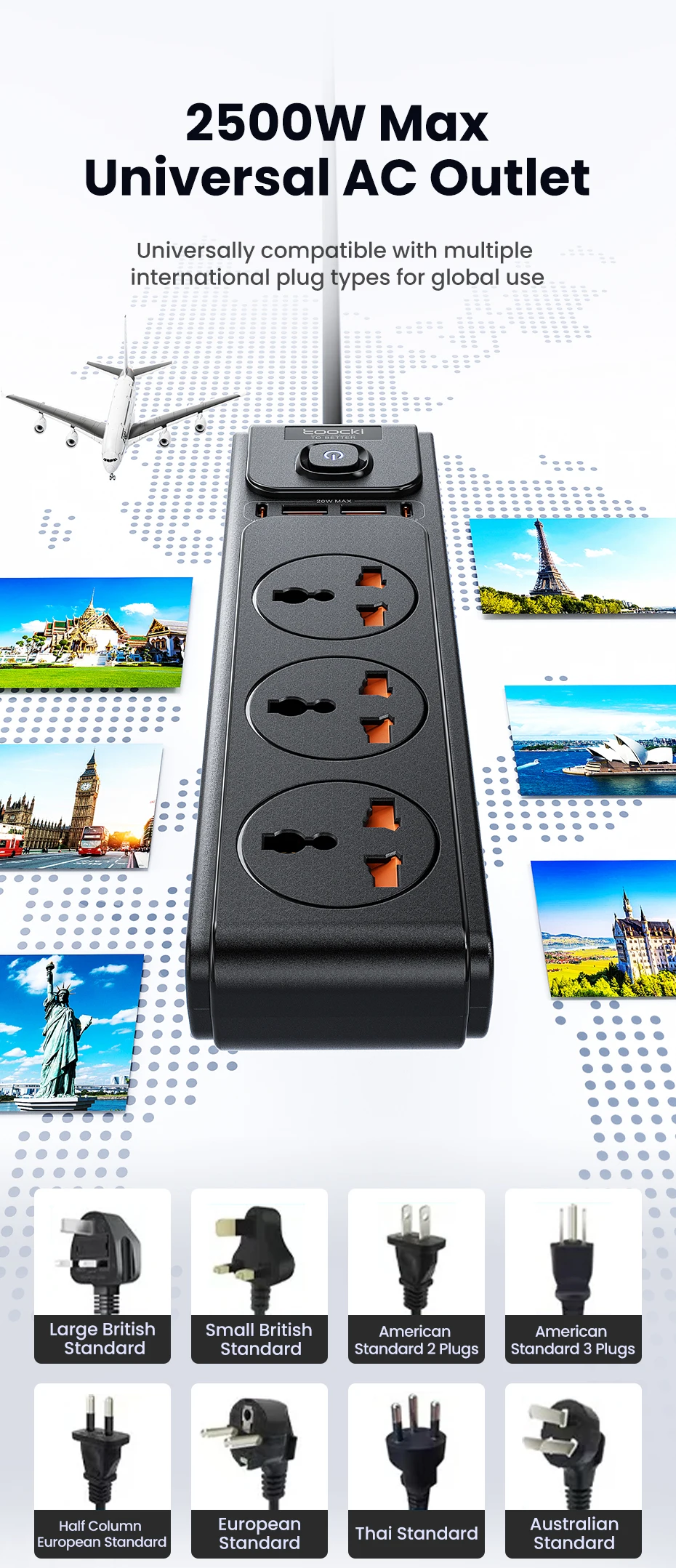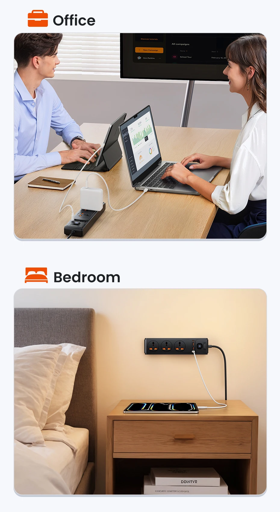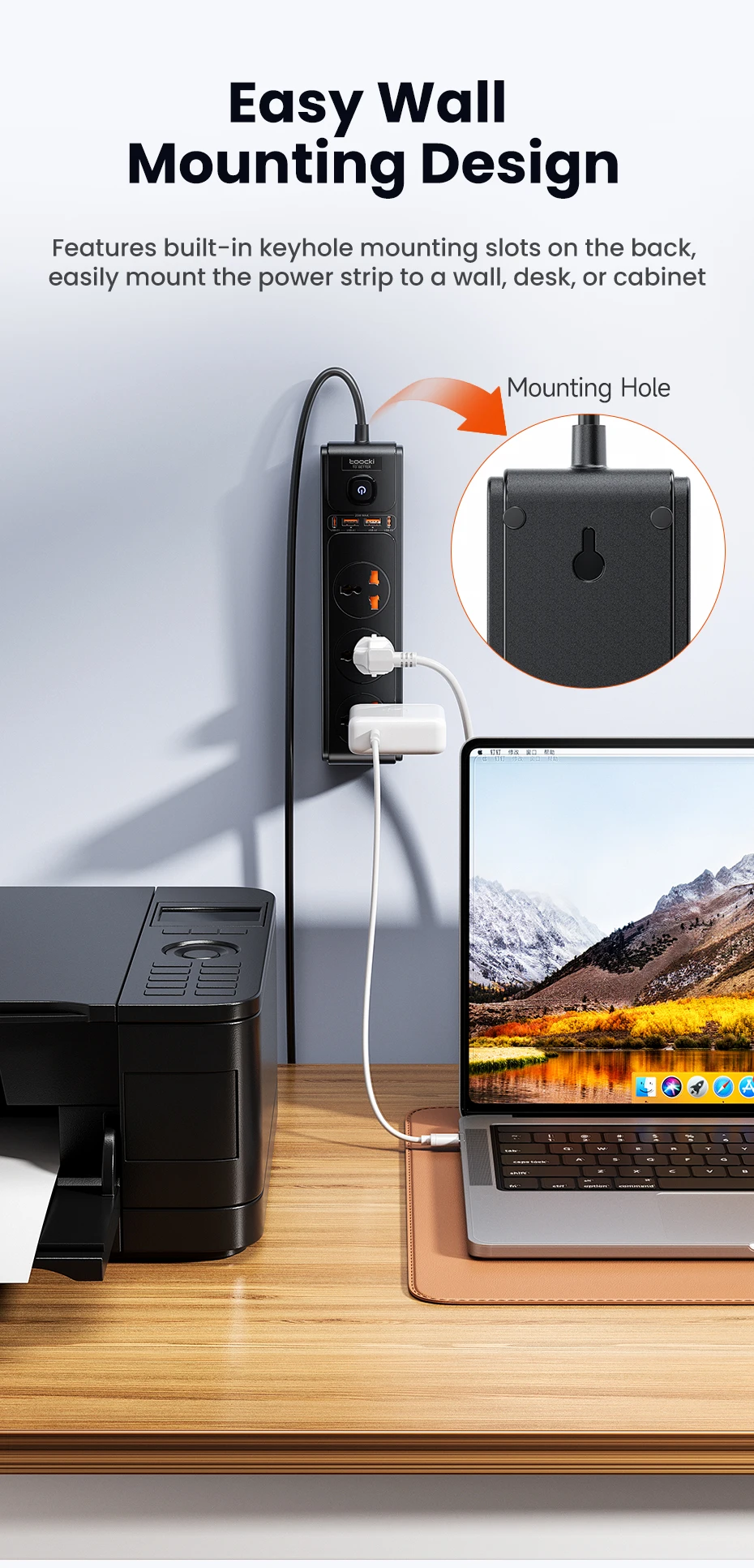 Equipped with mounting holes on the back, the power strip can be easily mounted on walls, under desktops, beside beds, etc.