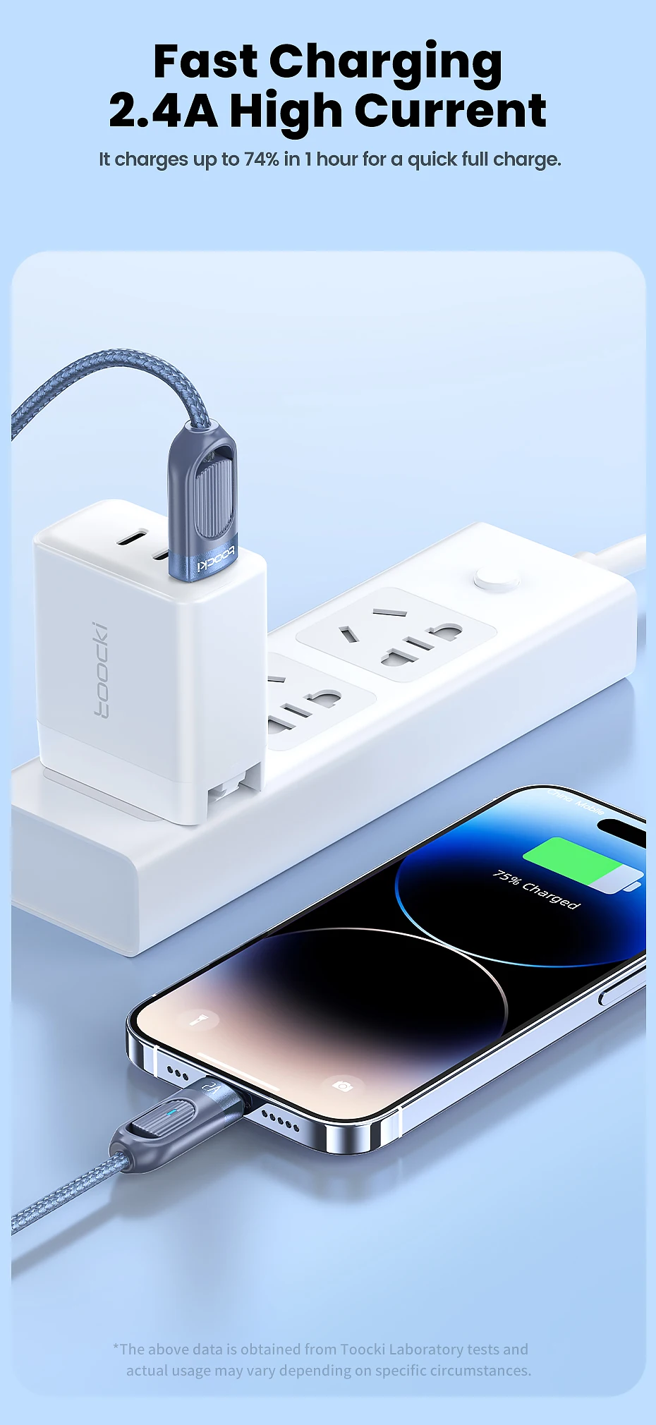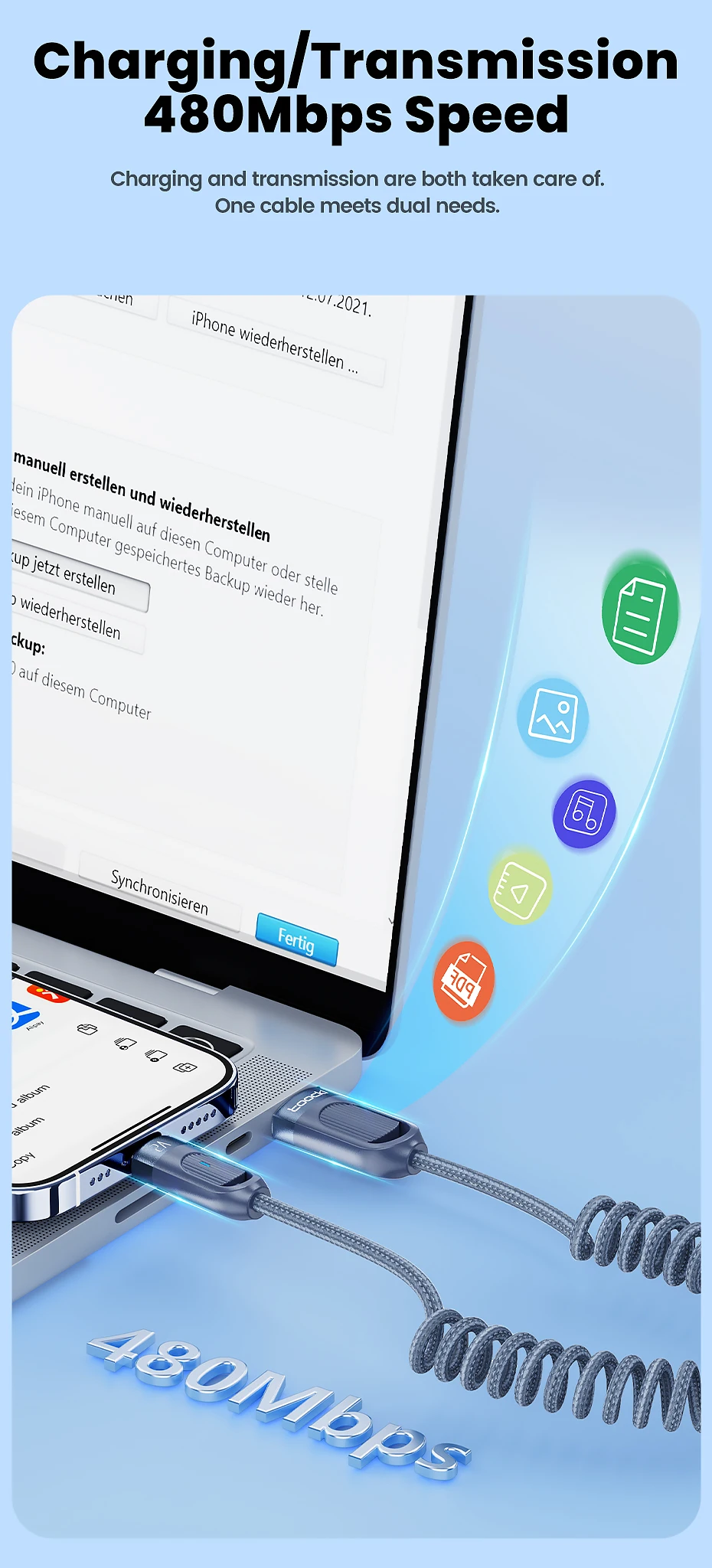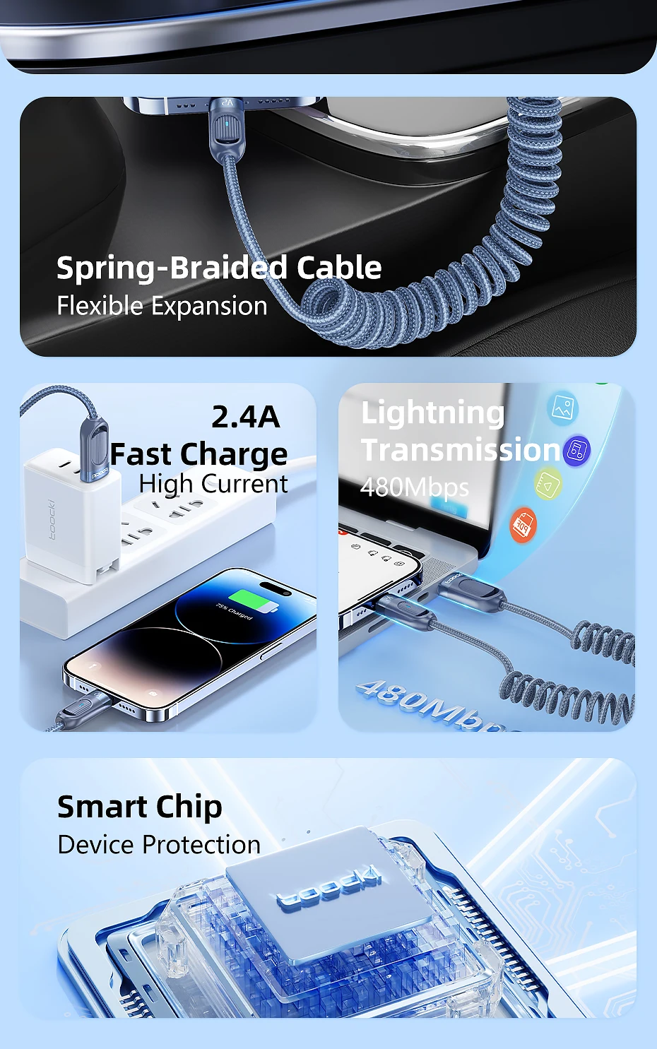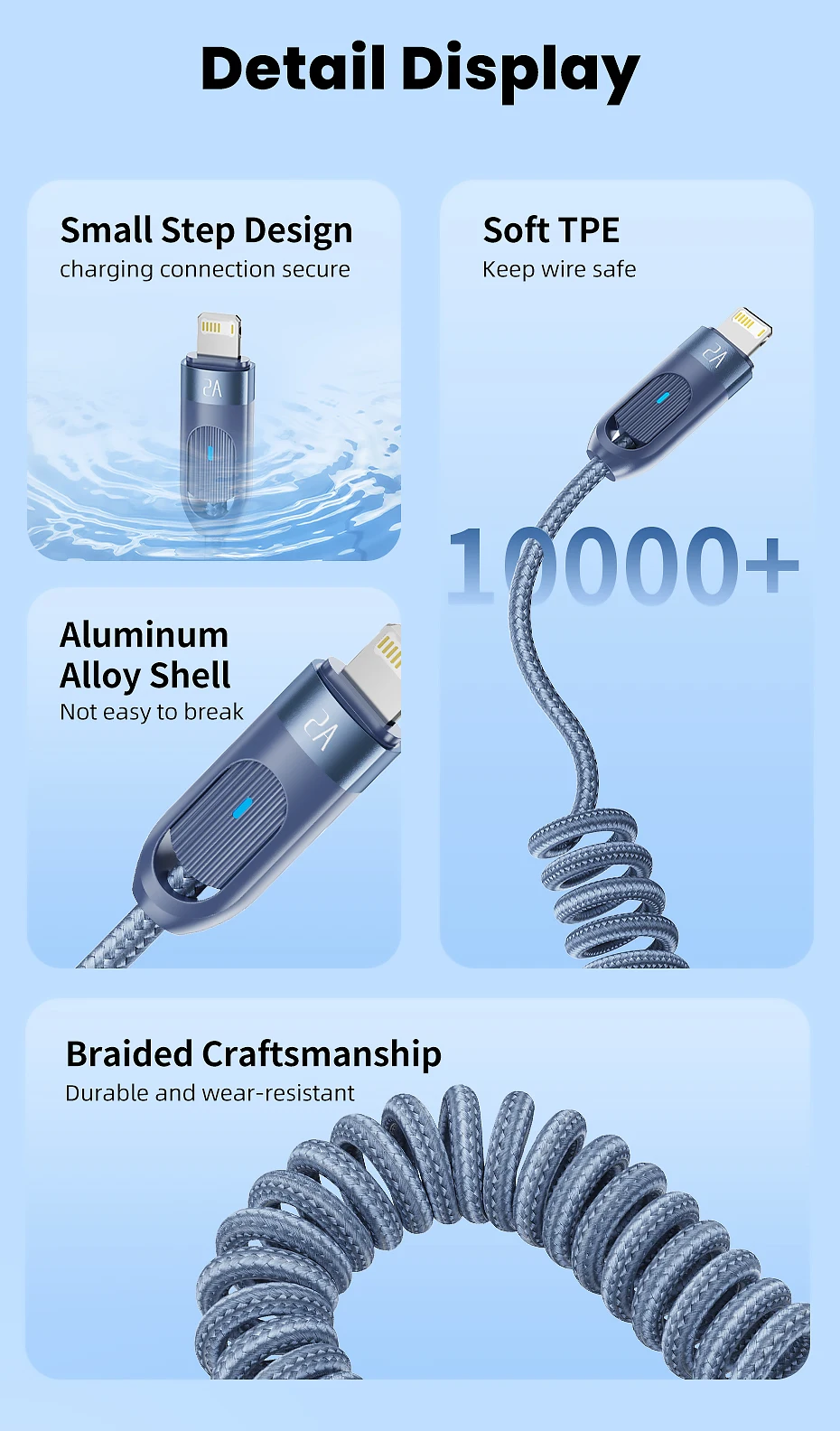 Núcleo interior de TPU de alta elasticidad, no es fácil de anudar ni enredar, diga adiós a los problemas de almacenamiento.Cuerpo exterior trenzado, duradero y resistente al desgaste.