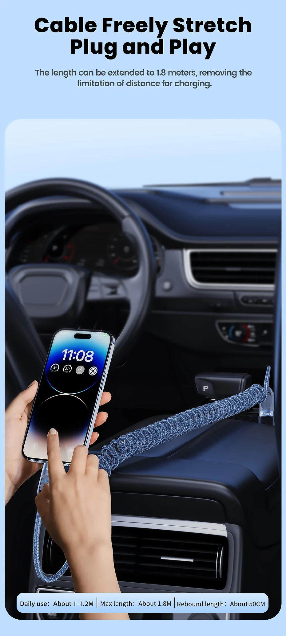 La longitud se puede ampliar hasta 1,8 metros, eliminando la limitación de distancia para cargar.