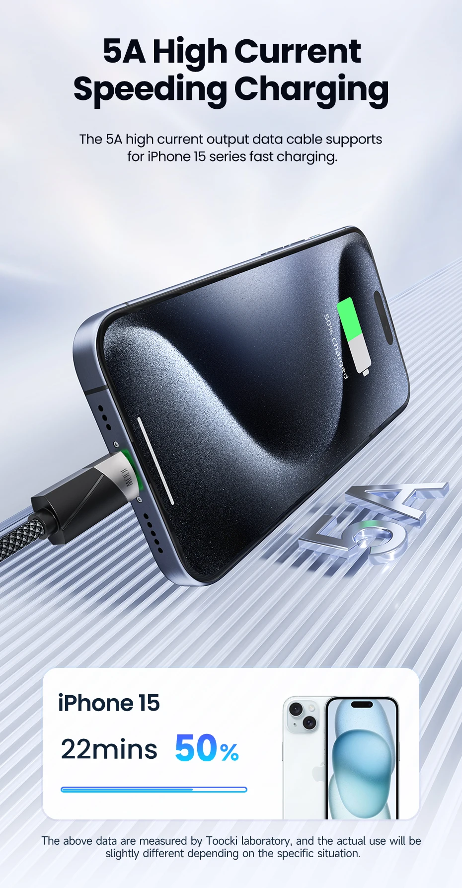 Carga de alta velocidad de 5A El cable de datos de salida de alta corriente de 5A es compatible con la carga rápida de la serie iPhone 15.
