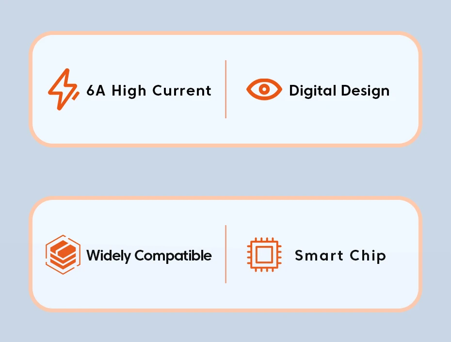 Corriente máxima de 6A:Cargue sus dispositivos de manera eficiente con una corriente máxima de 6A.