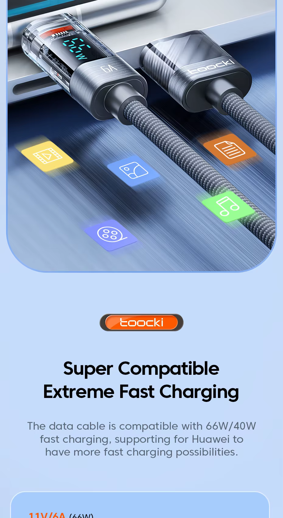 Toocki-Cable USB tipo C 6A para Huawei Mate 40 Pro, cargador de carga rápida de 66W, Cable USB A a USB C para Xiaomi 13 Oneplus Realme Oppo
