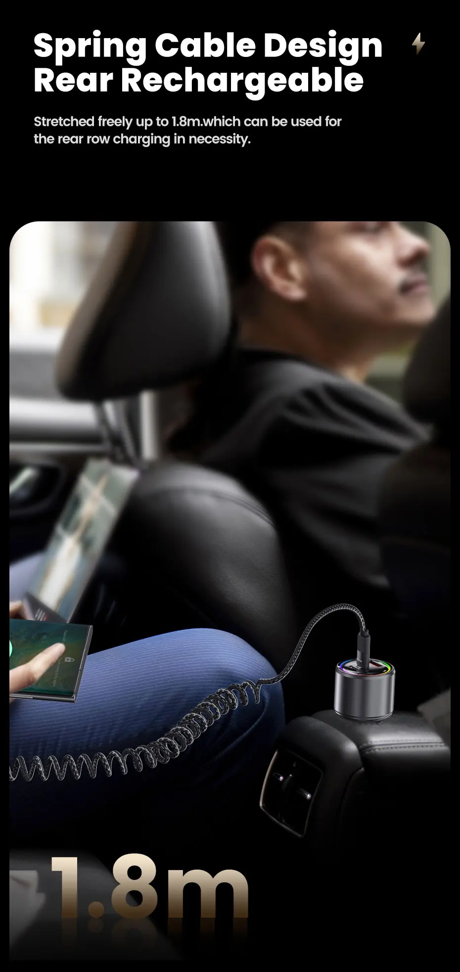 ✅Diseño de cable de resorte trasero recargable: Estirado libremente hasta 1,8 m. que se puede utilizar para la carga de la fila trasera en caso necesario.