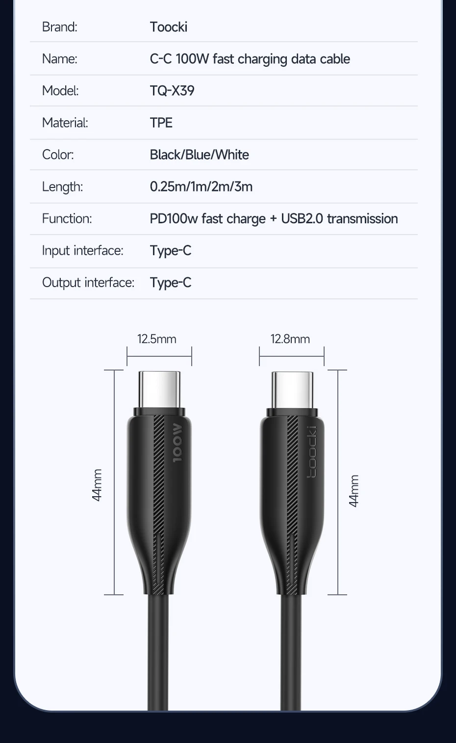 Toocki-Cable USB tipo C de carga rápida, 100W, 5A, PD, para Macbook, Samsung, Huawei, XIoami, Realme, 100W
