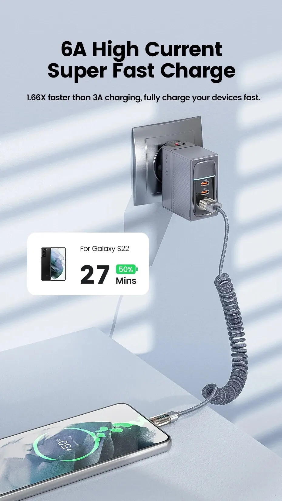 [6A alta corriente de carga súper rápida1.66x más rápido que la carga 3a, carga completamente sus dispositivos rápido.