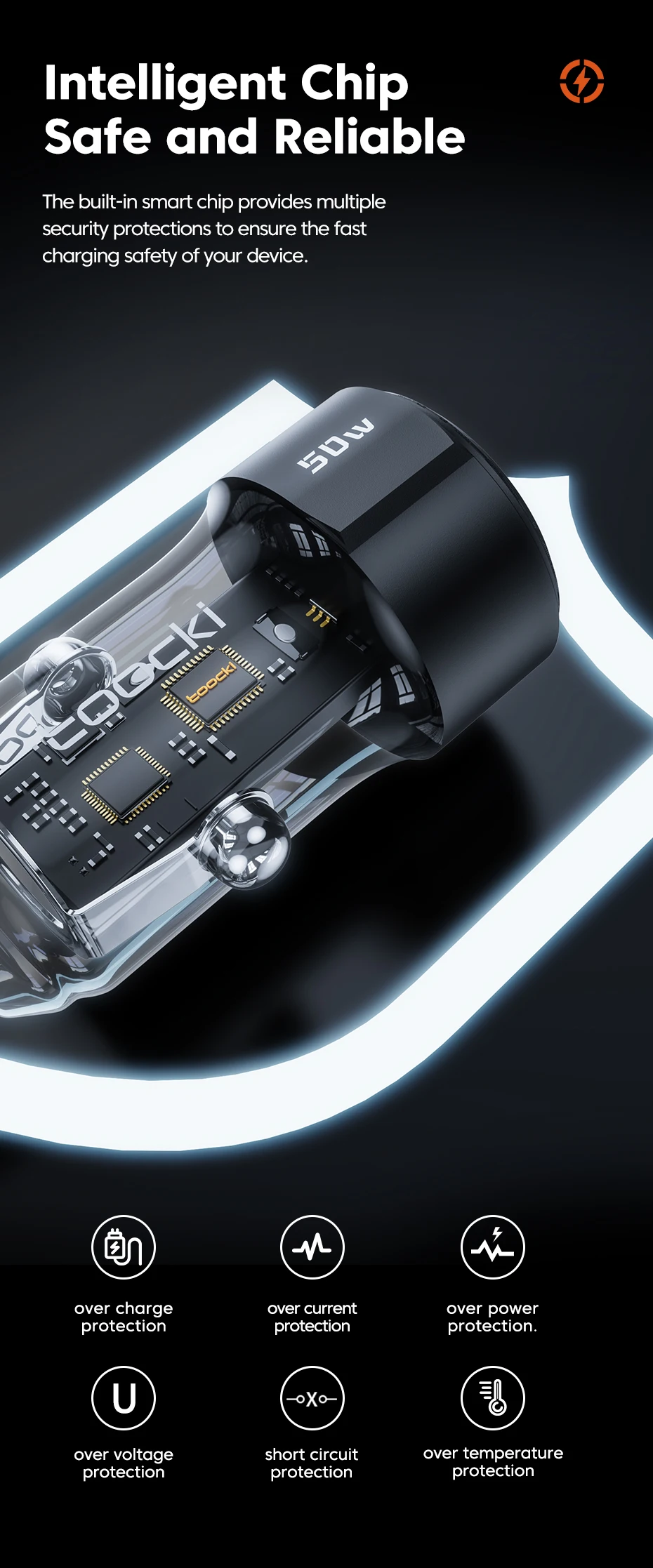 El chip inteligente incorporado proporciona múltiples protecciones de seguridad para garantizar la seguridad de carga rápida de su dispositivo.