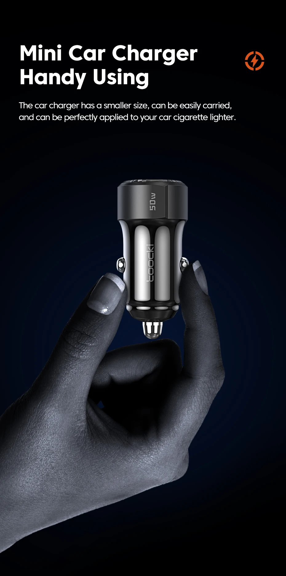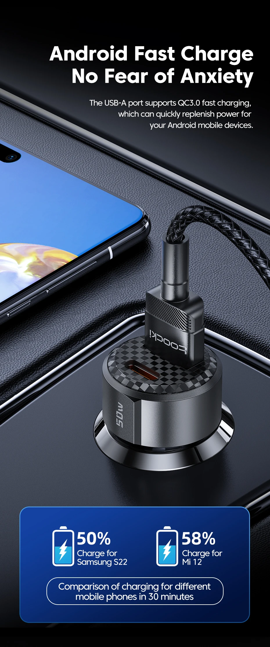 [Cargador de coche 50W]Carga rápida de doble puerto, diseño ultra Mini, + QC3.0 PD3.0, protección de seguridad inteligente