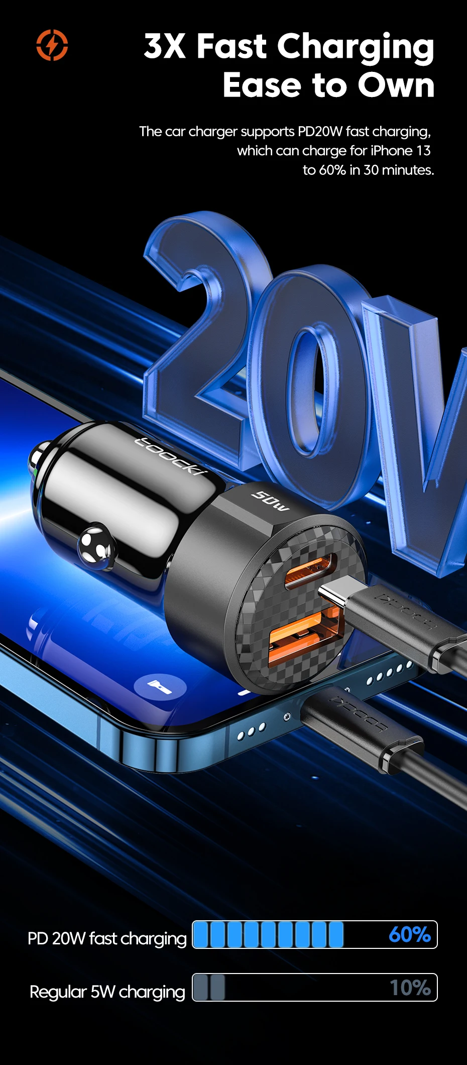 El cargador de coche soporta PD18W carga rápida, que puede cargar para el iPhone 13 a 60% en 30 minutos.