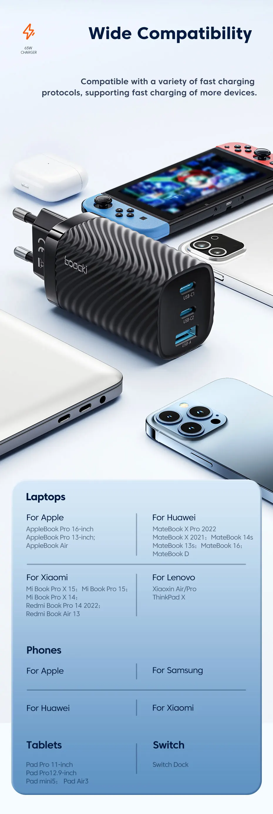 Comprar Toocki-cargador GaN de 65W tipo C, dispositivo de carga rápida 4,0 PD para iPhone 14, Macbook, Xiaomi, Samsung S23, Ultra USB