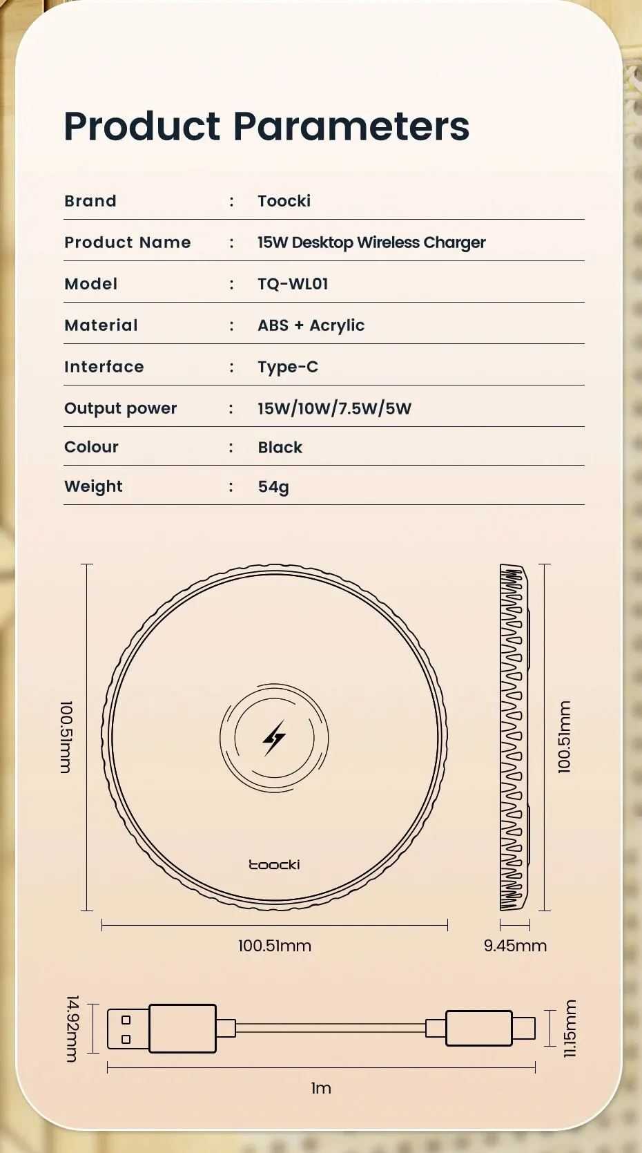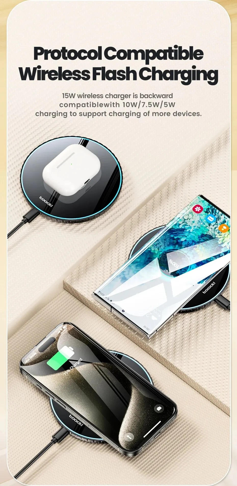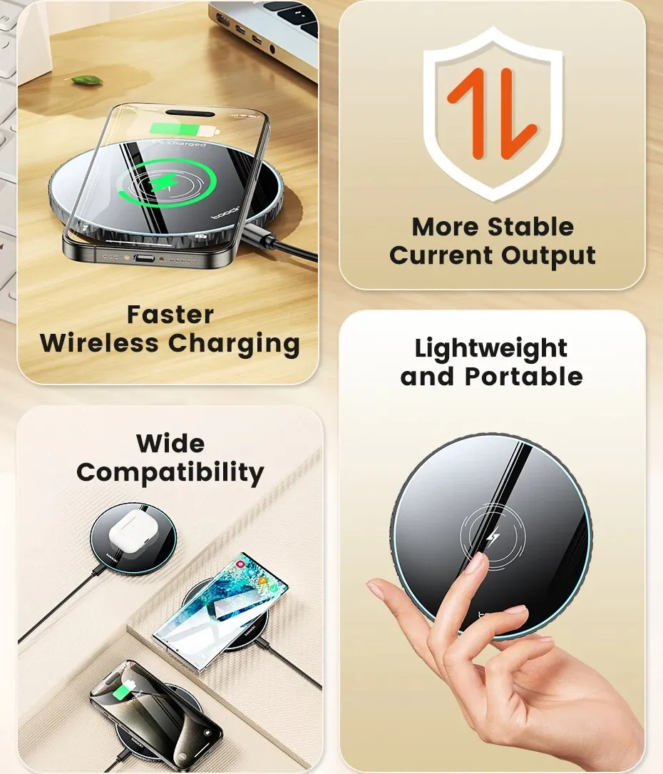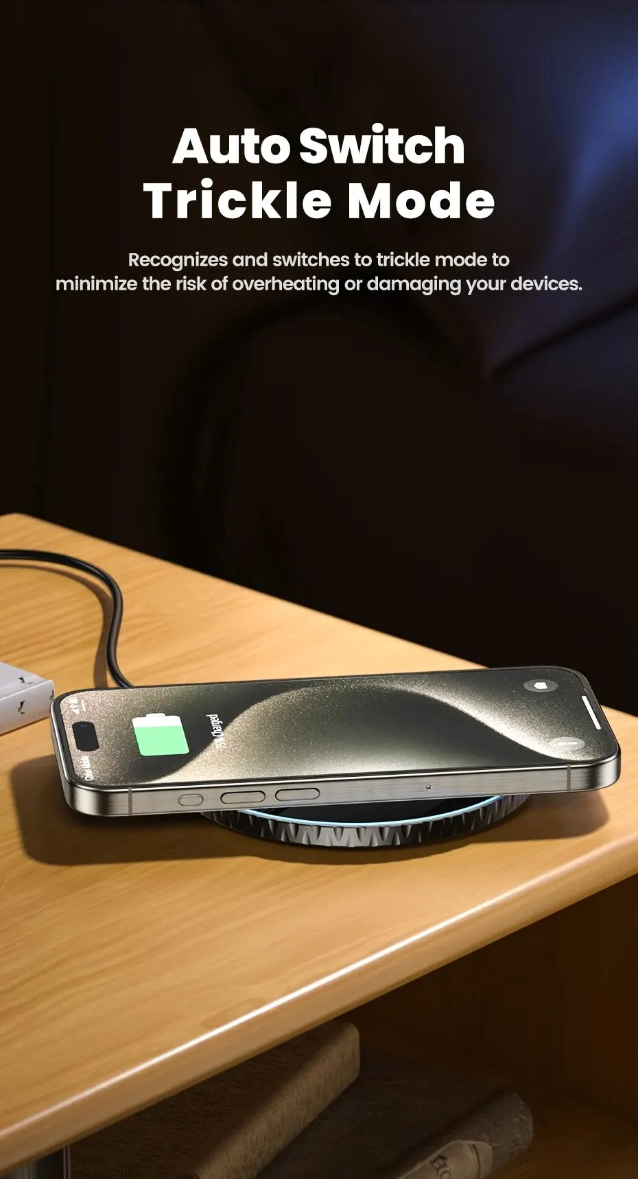 Teléfono Xiaomi 15t pro Pedí 3 cargadores inalámbricos. Aproximadamente los mismos resultados 1.75 amperios 7 vatios - en un caso. 1.95 amperios 7.4 vatios - sin carcasa. El artículo se ve bien, los materiales son agradables, pero la parte superior es brillante y se ensucia fácilmente.