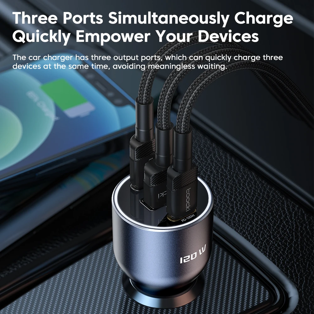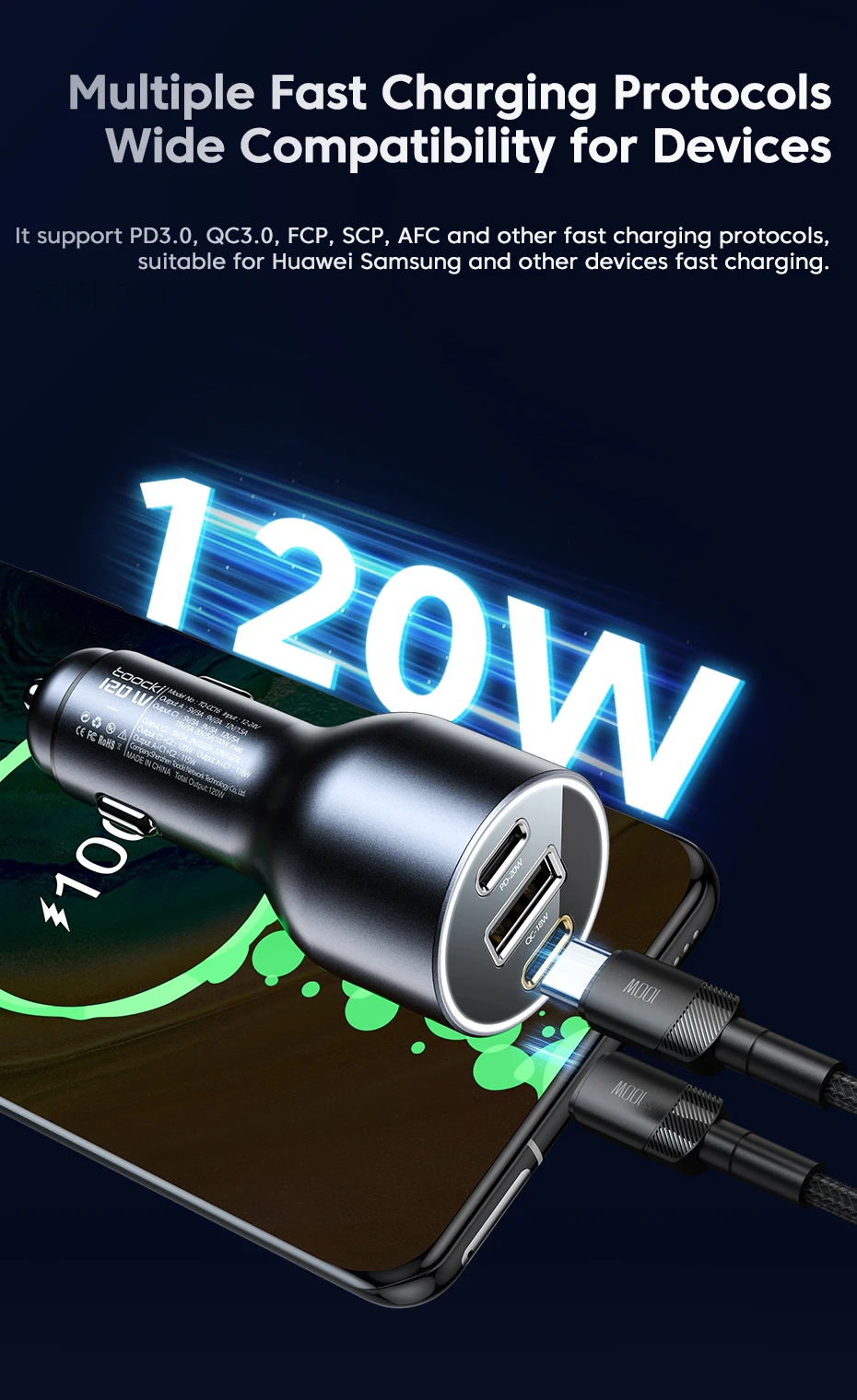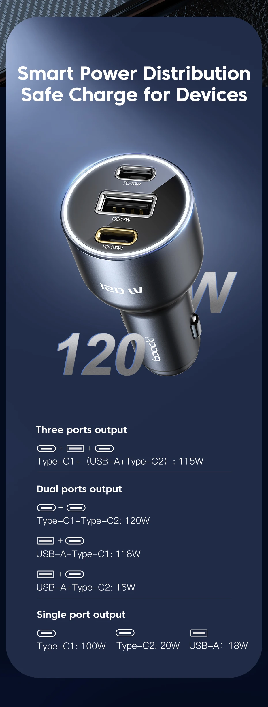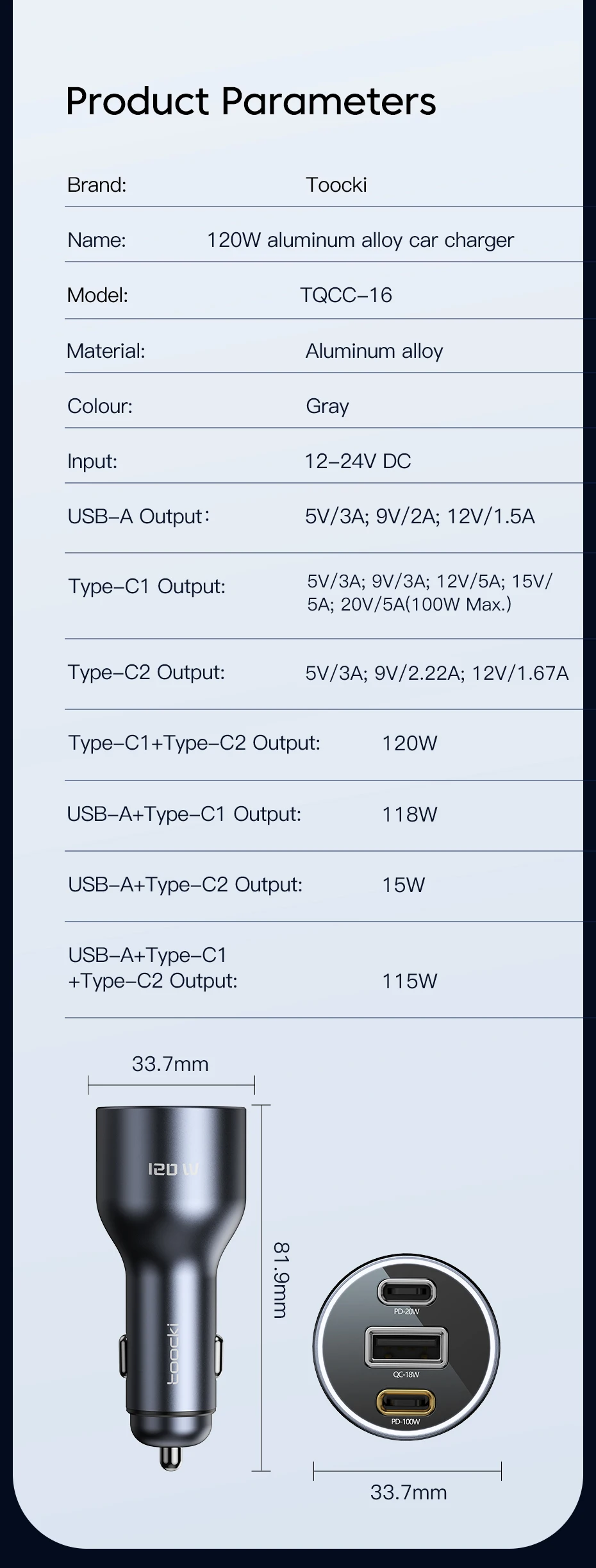 Comprar Toocki-cargador de teléfono para coche, dispositivo de carga rápida de 120W, USB tipo C, Q4.0, PD3.0, para iPhone 14, 13, 12, Samsung, Xiaomi, Macbook y portátil