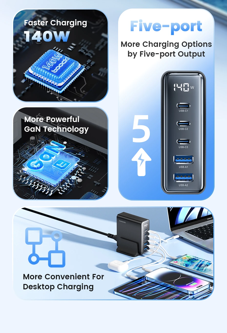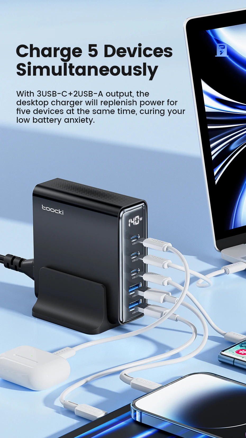 Con 3usb-c + 2usb-a salida, el cargador de escritorio repondrá la energía para cinco dispositivos al mismo tiempo.