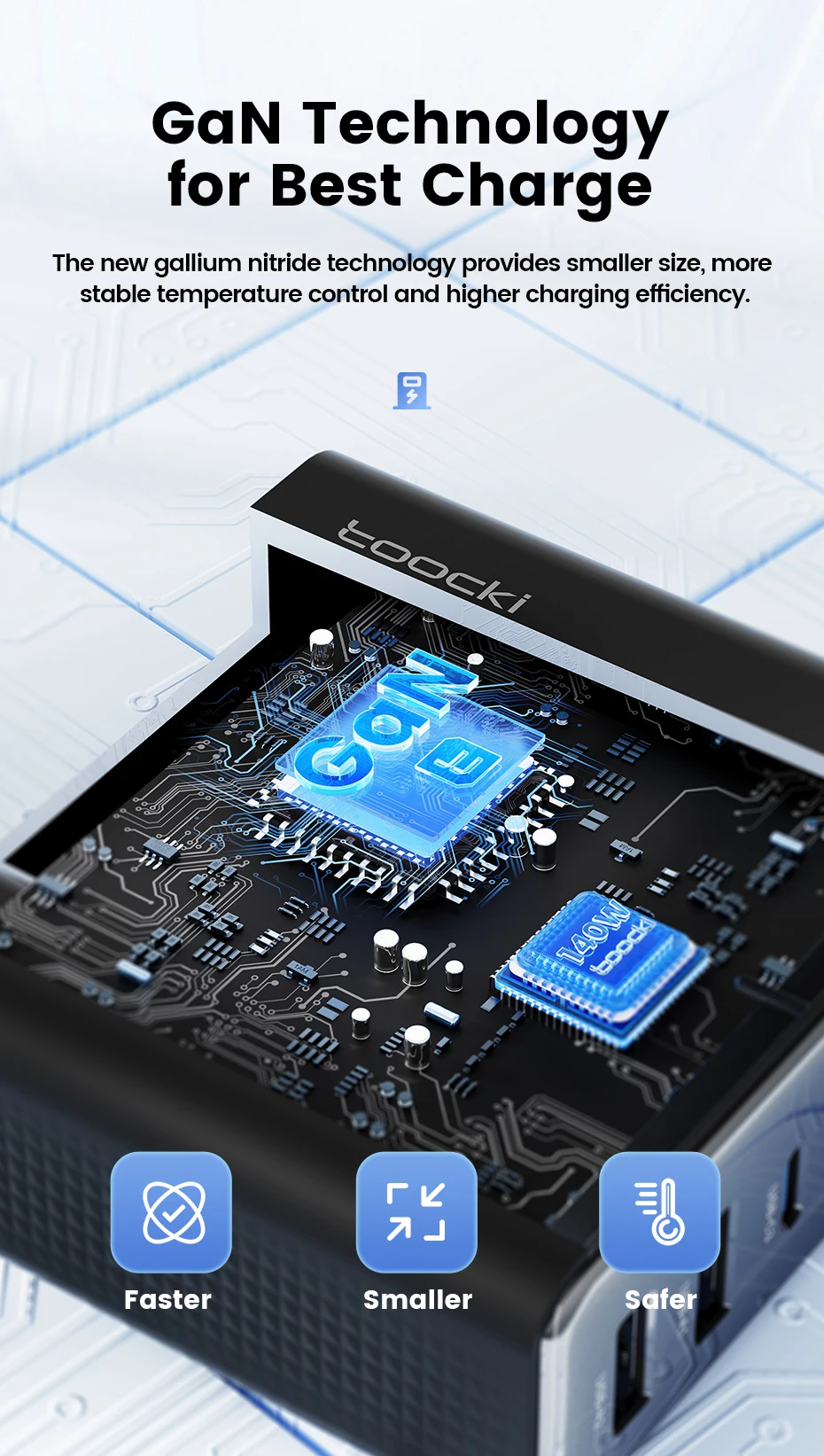 El cargador USB Toocki 140W GaN utiliza la tecnología GaN, lo que lo hace más pequeño y más eficiente que los cargadores tradicionales.