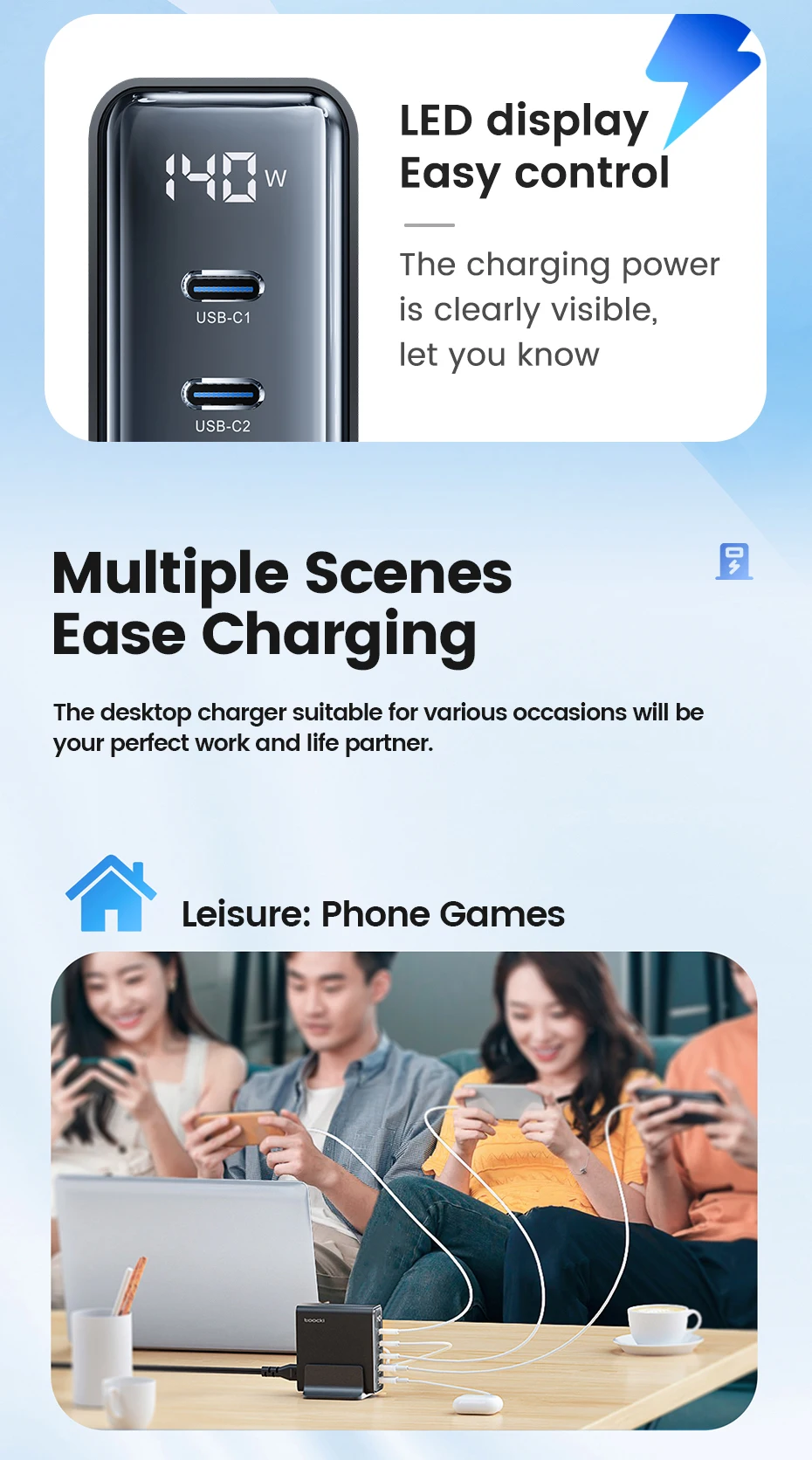 [Cargador de escritorio de 140W] En comparación con los cargadores comunes, los cargadores de escritorio no solo ocupan menos espacio en el escritorio, sino que también hacen que su escritorio sea más ordenado.