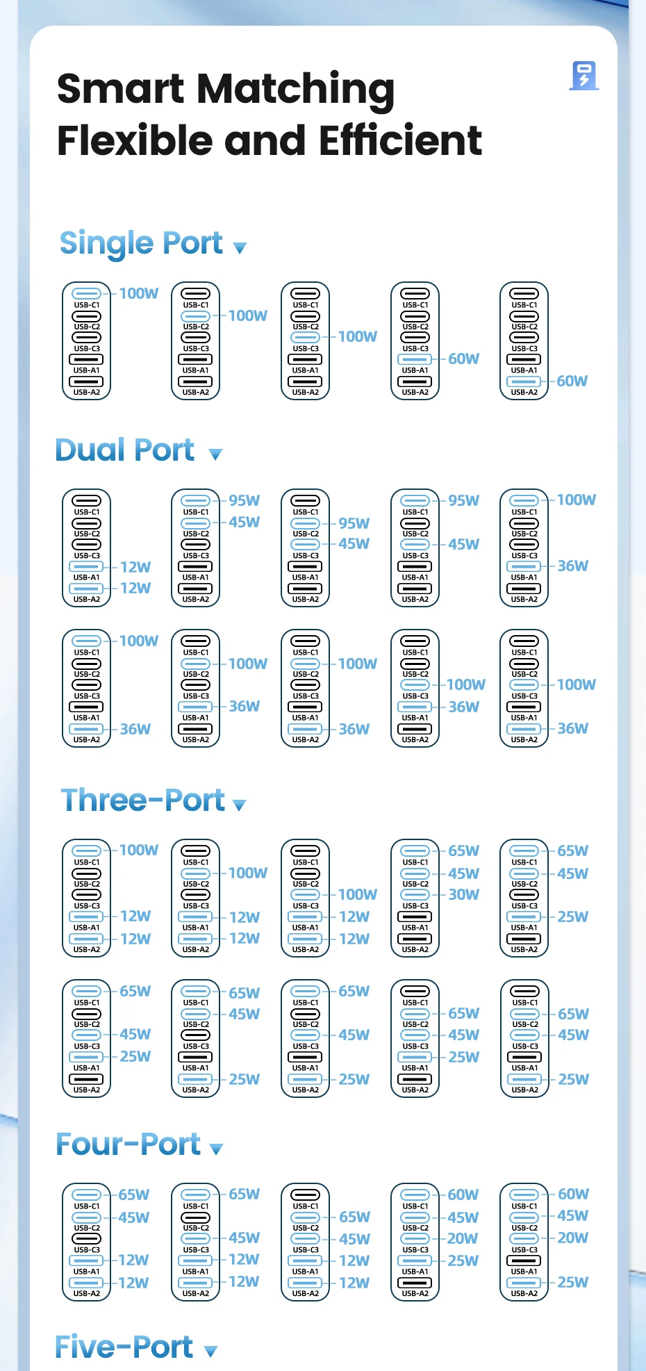 Con 3usb-c + 2usb-a salida, el cargador de escritorio repondrá la energía para cinco dispositivos al mismo tiempo.