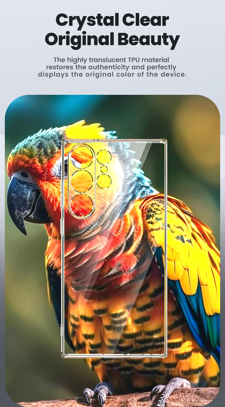 El material TPU altamente translúcido restaura la autenticidad y muestra perfectamente el color original del dispositivo.