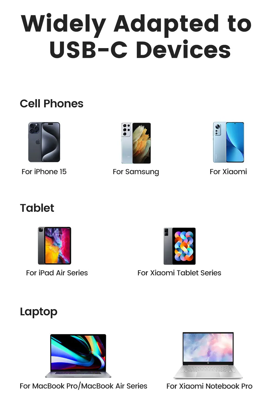 • Adaptador PD 60W :Este adaptador de alta potencia PD 60W garantiza una carga rápida y eficiente para tus dispositivos iOS y Mac, como el iPhone 15 Pro y el portátil.