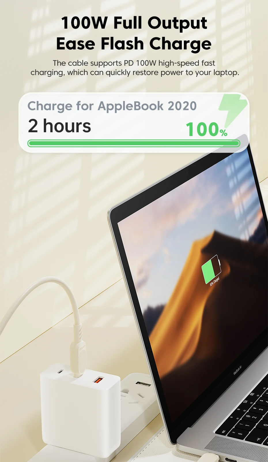 El cable admite la carga rápida de alta velocidad PD 100W, que puede restaurar rápidamente la energía a su computadora portátil.