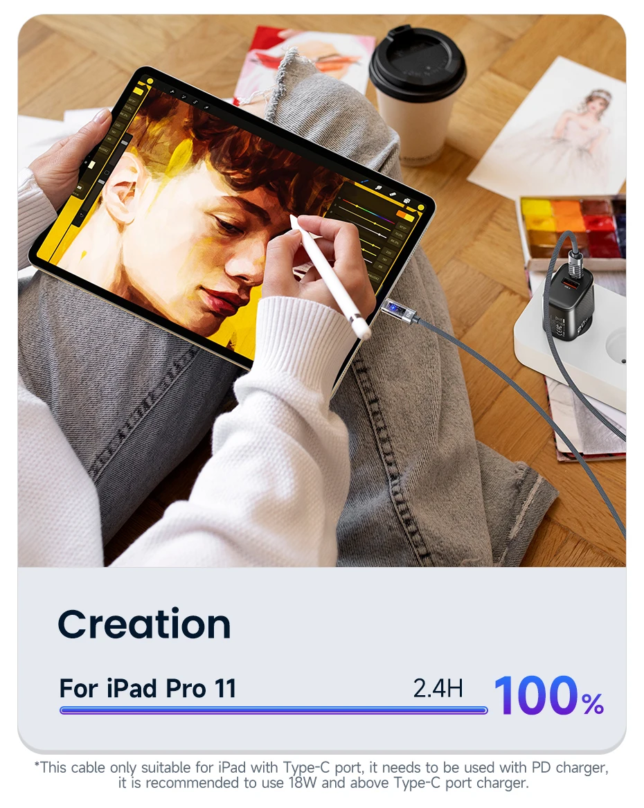 *Este cable solo es adecuado para iPad con puerto tipo C, debe usarse con un cargador PD, se recomienda usar un cargador de puerto tipo C de 18 W y superior.