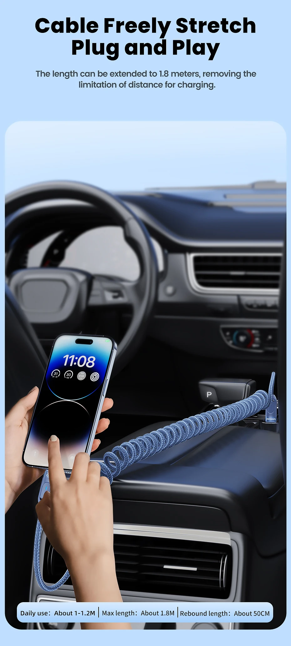 La longitud se puede ampliar hasta 1,8 metros, eliminando la limitación de distancia para cargar.