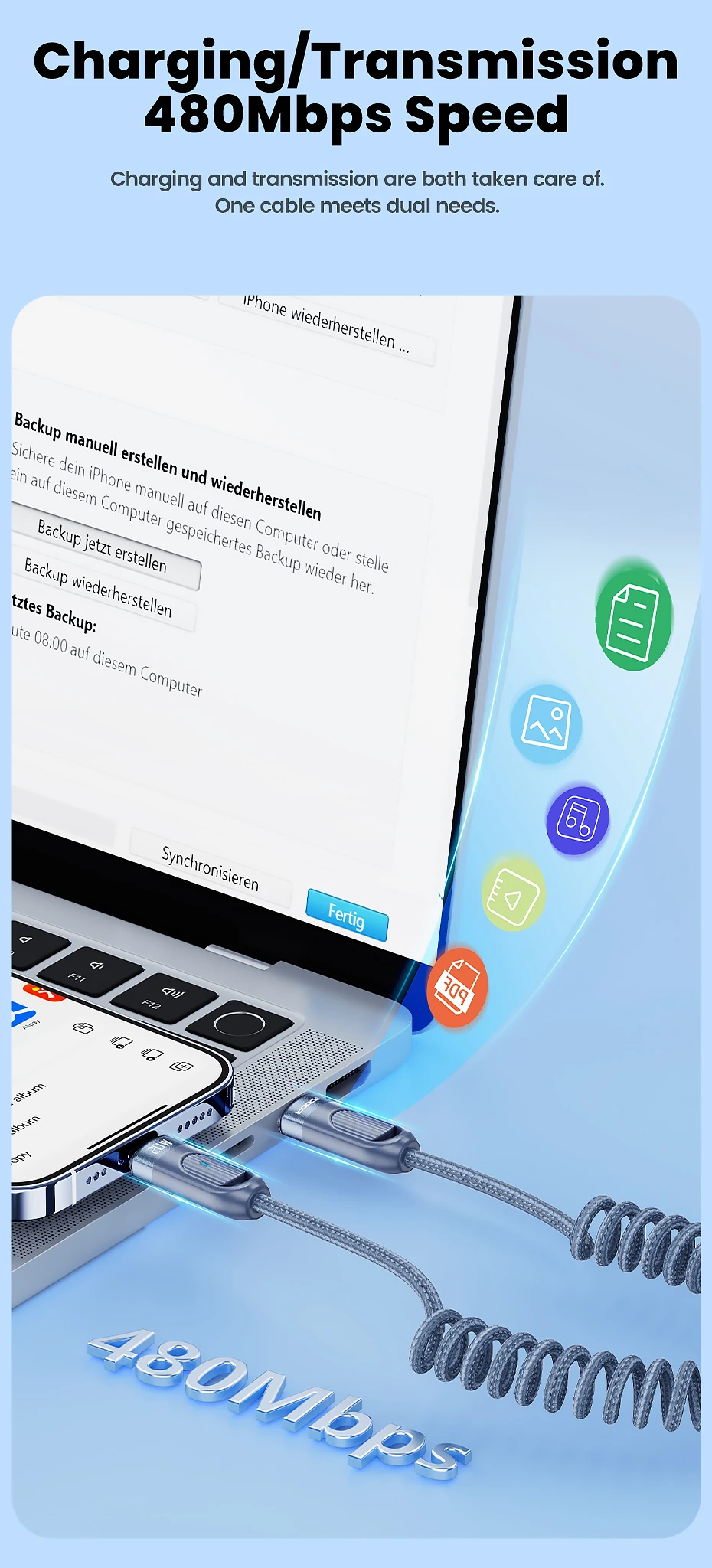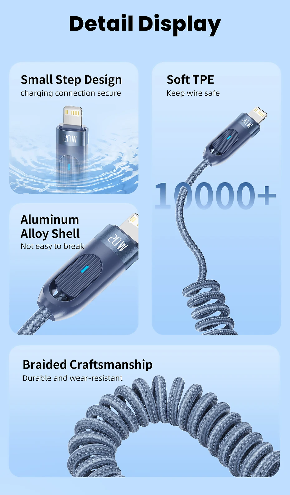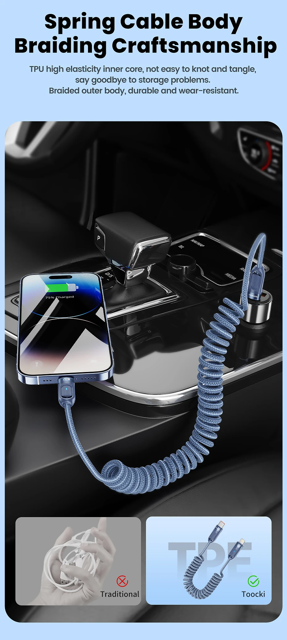 Núcleo interior de TPU de alta elasticidad, no es fácil de anudar ni enredar, diga adiós a los problemas de almacenamiento.Cuerpo exterior trenzado, duradero y resistente al desgaste.