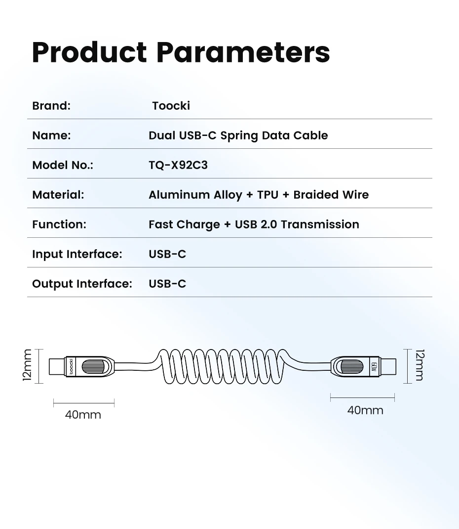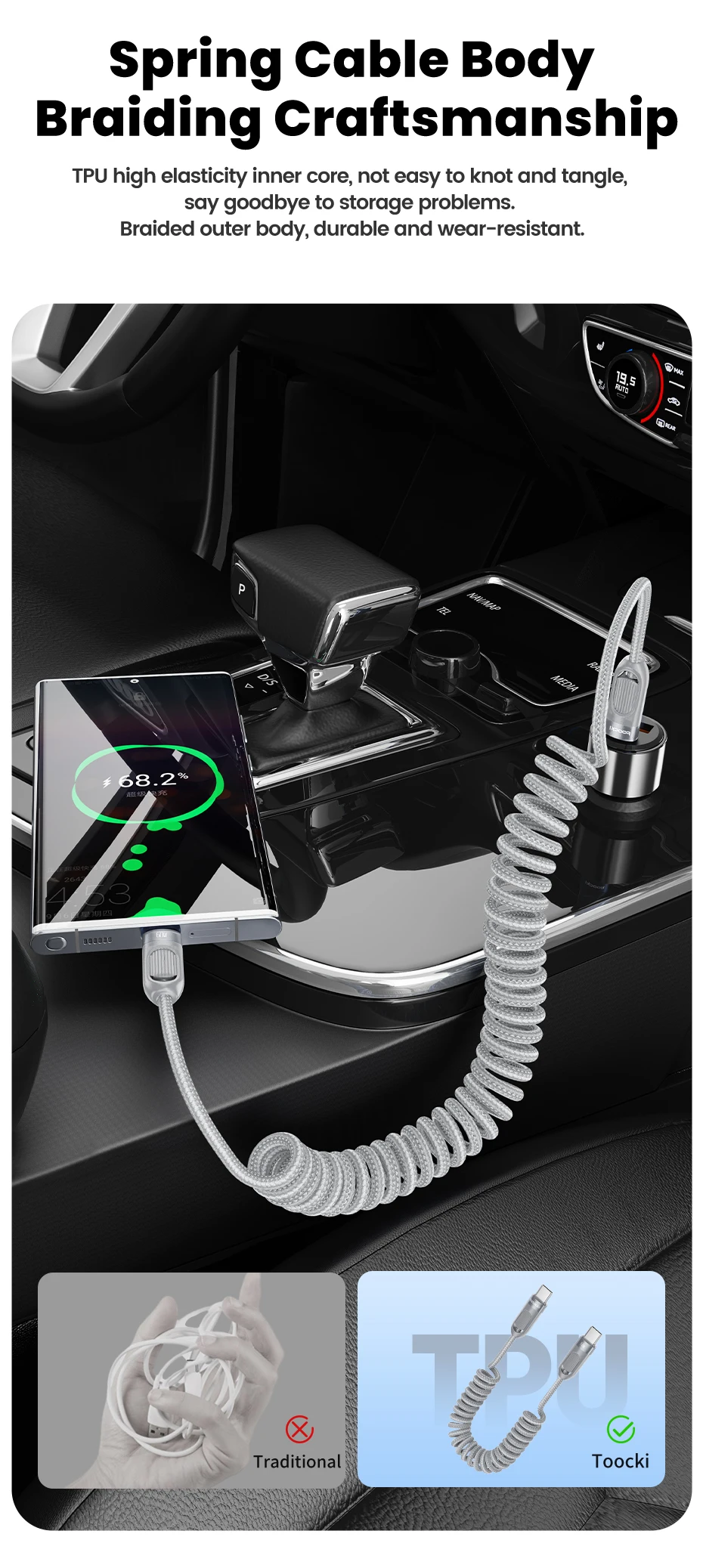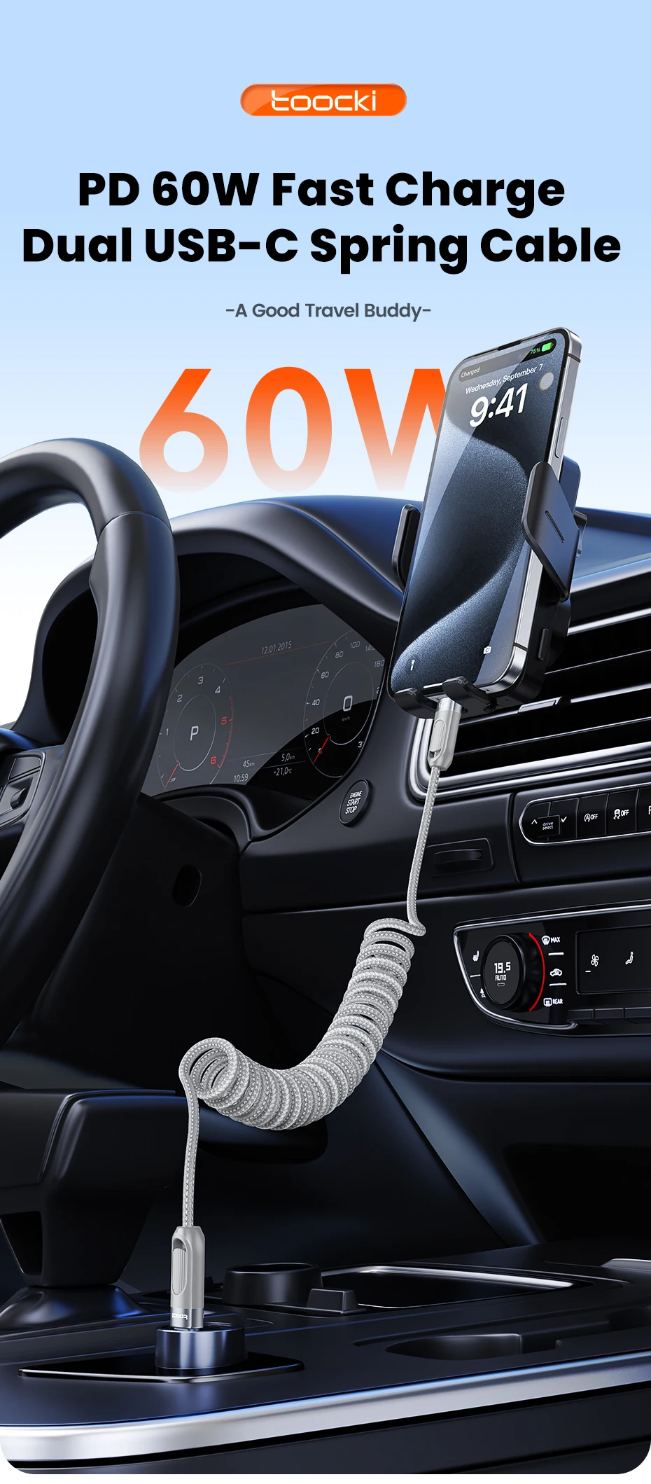 Toocki PD 60W USB C a USB C Cable de carga rápida tipo C Cable USB de resorte para coche para iPhone 17 16 15 Pro Max Xiaomi Samsung S23 SS24