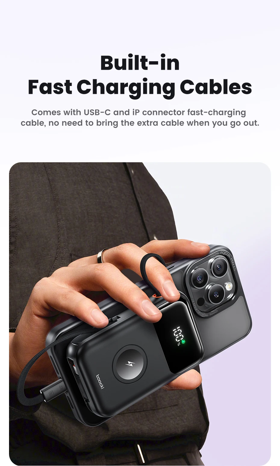 Comes with UsB-c and iP connector fast-charging cable, no need to bring the extra cable when you go out