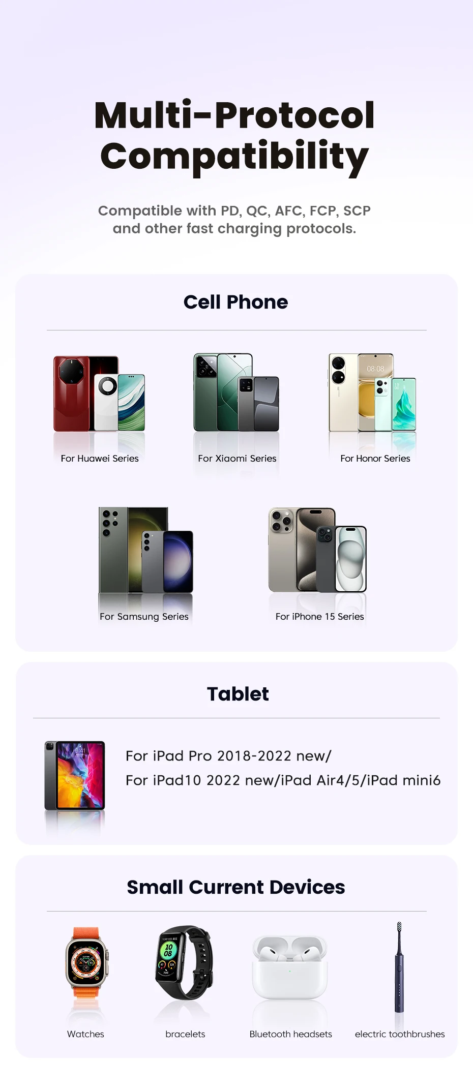 Compatible with PD, QC, AFC, FCP, SCP and other fast charging protocols