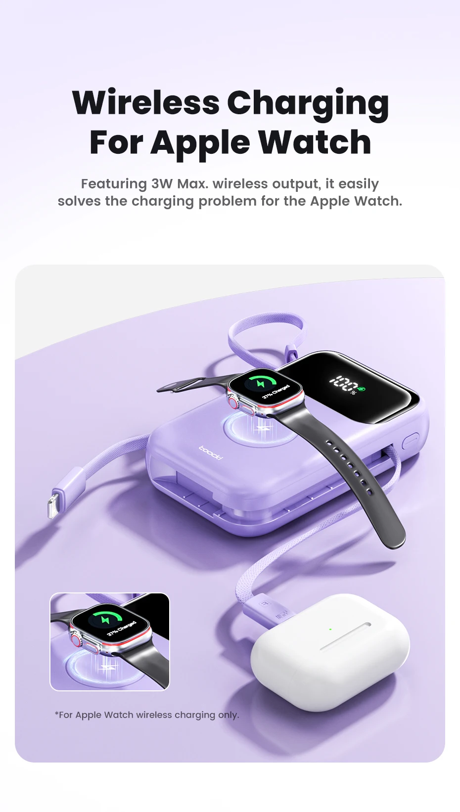 Featuring 3W Max. wireless output, it easily solves the charging problem for the Apple Watch