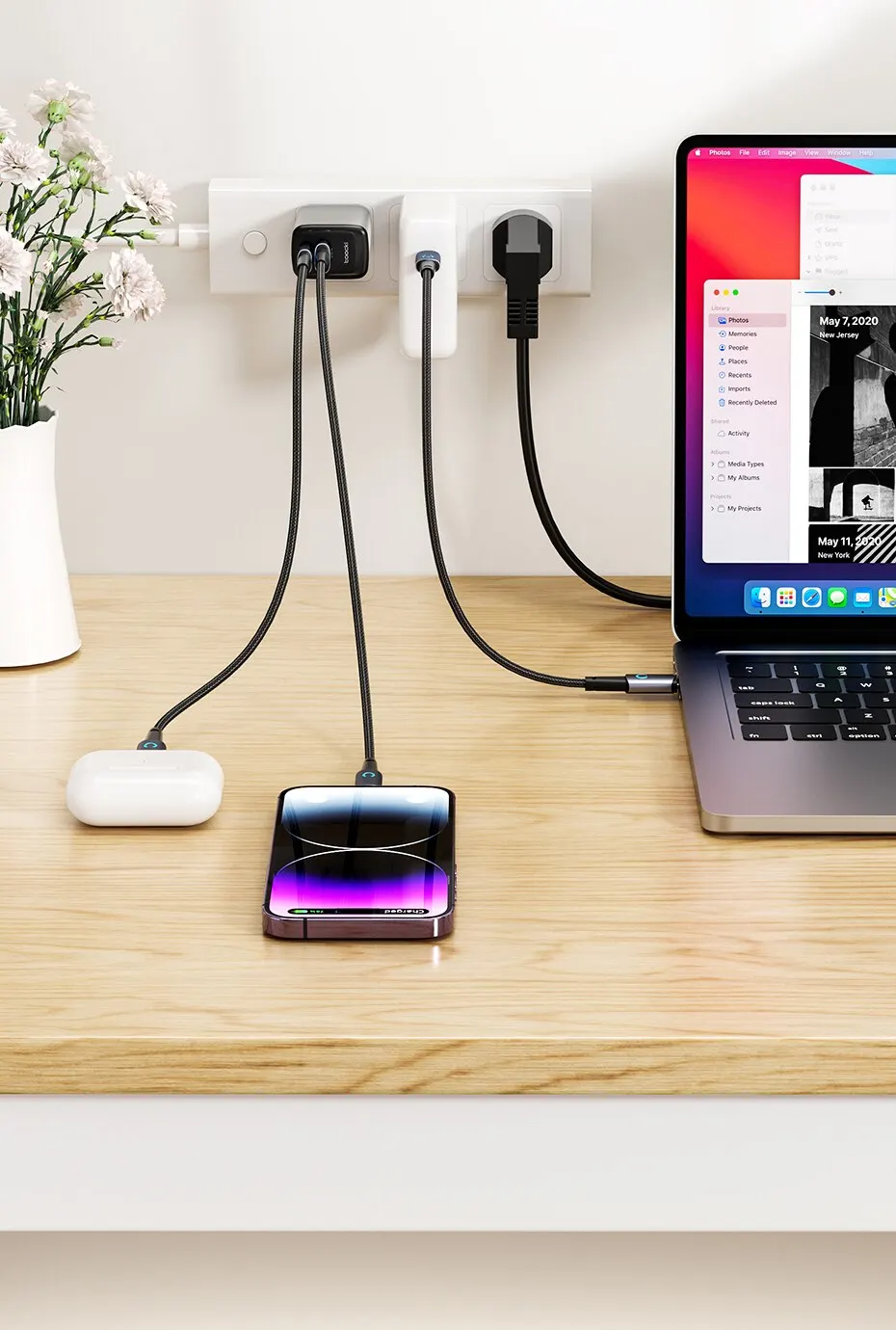 • Soporte de almacenamiento de cargador USB tipo C GaN :El soporte está diseñado para almacenar el cargador de su teléfono de forma segura y mantenerlo organizado. Puede contener cargadores GaN y USB tipo C.