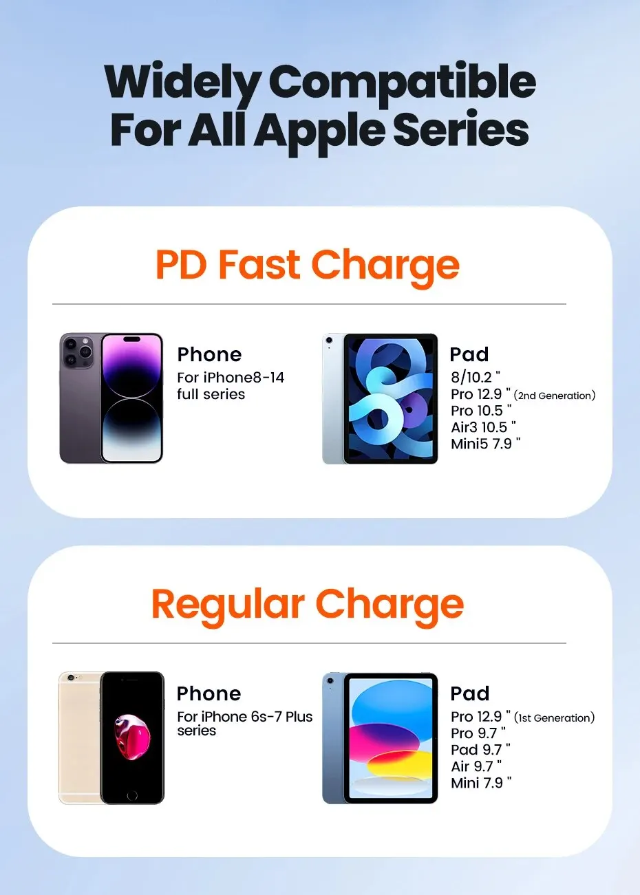 Compatible con PD 20W y PD 18W carga rápida de las series de teléfonos móviles Apple, la carga tarda 30 minutos al 60%.