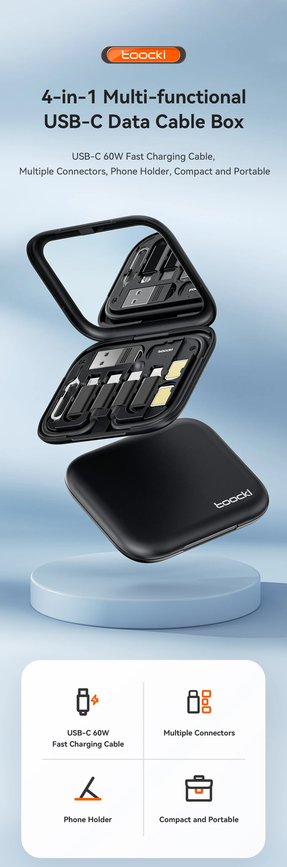[4-in-1 Multi-functional ] USB-C Data Cable Box, USB C 60W Fast Charging Cable, Multiple Connectors, Phone Holder, Compact and Portable