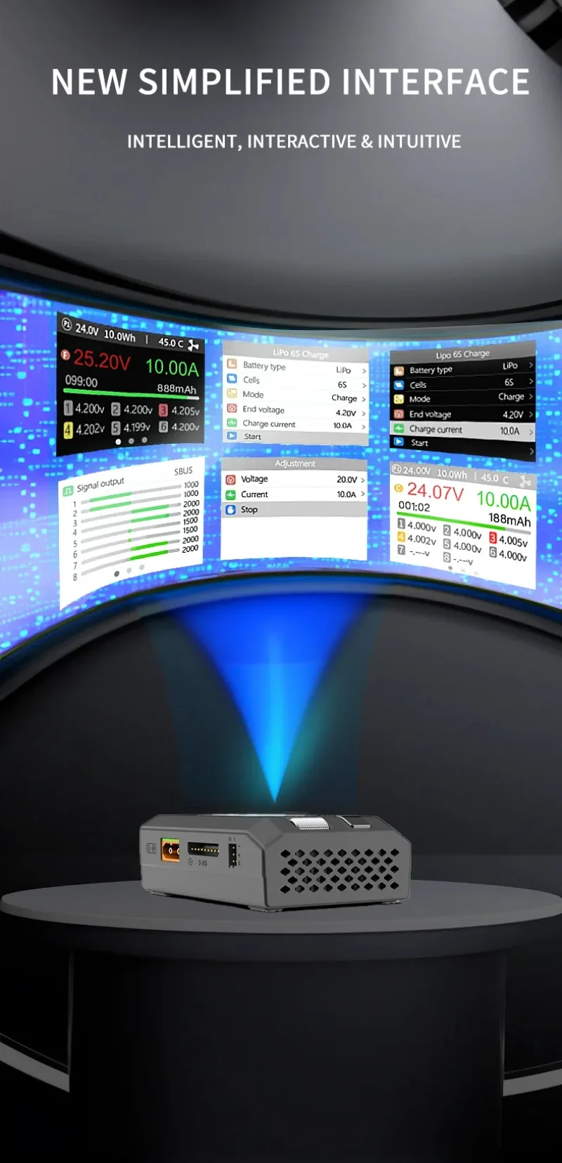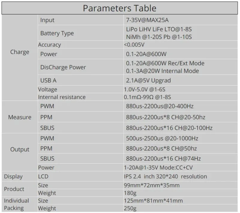 Cargas, descargas y balanzas (cuando corresponda) baterías LiPo, LiHV, LiFe, Lion, LTO 1-8S, NiMh 1-20S, PB 1-10S.