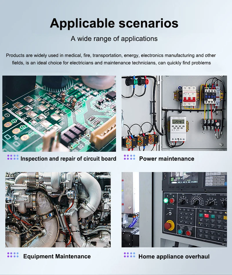【Amplias aplicaciones】: se puede utilizar para inspección y mantenimiento de placas de circuito, mantenimiento de fuentes de alimentación, mantenimiento de equipos electrónicos, revisión de electrodomésticos, es una opción ideal para técnicos de electrónica y mantenimiento.