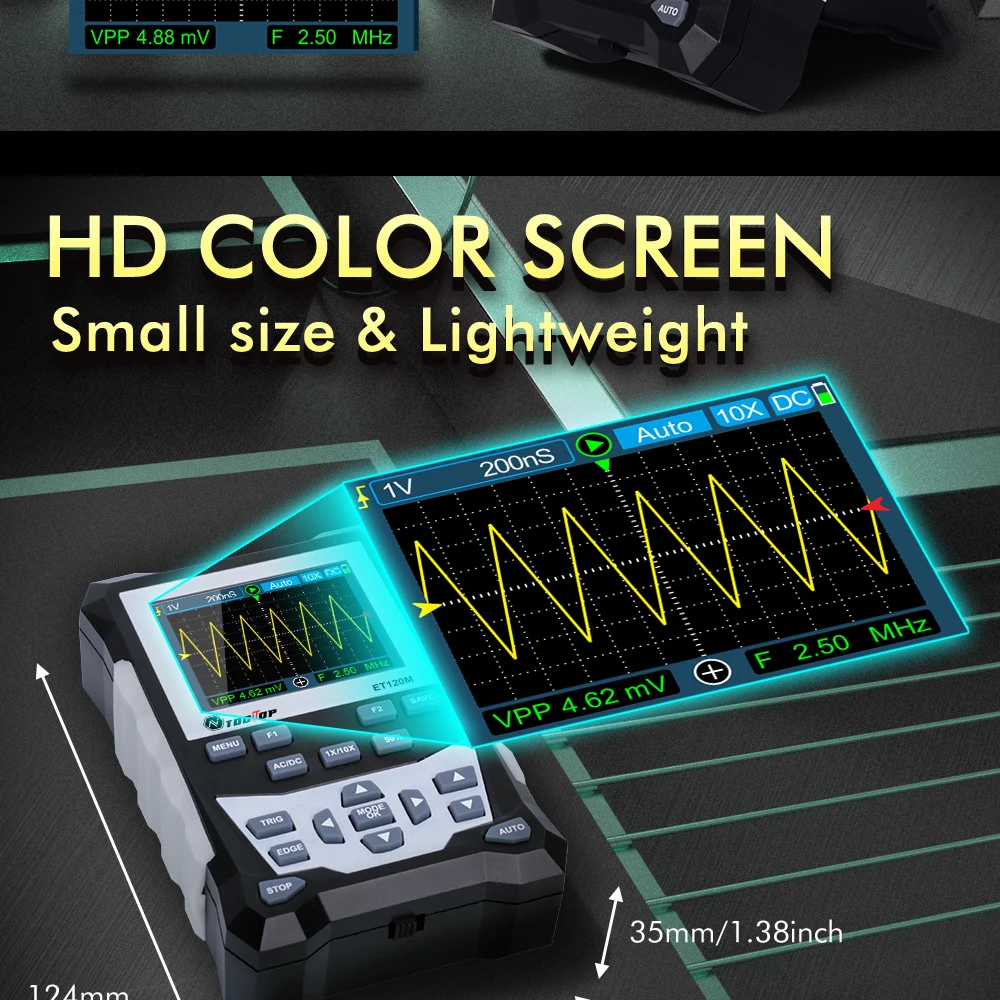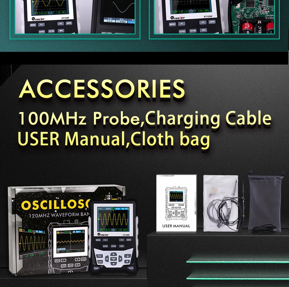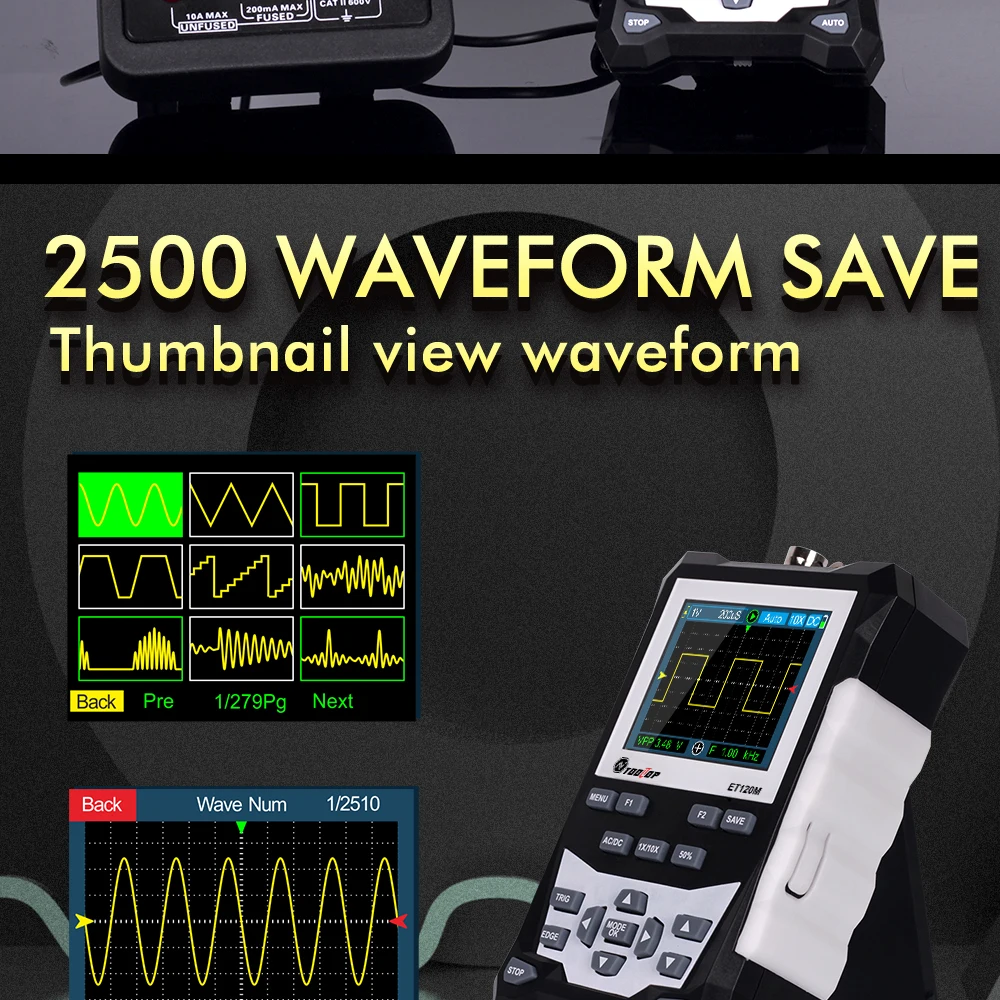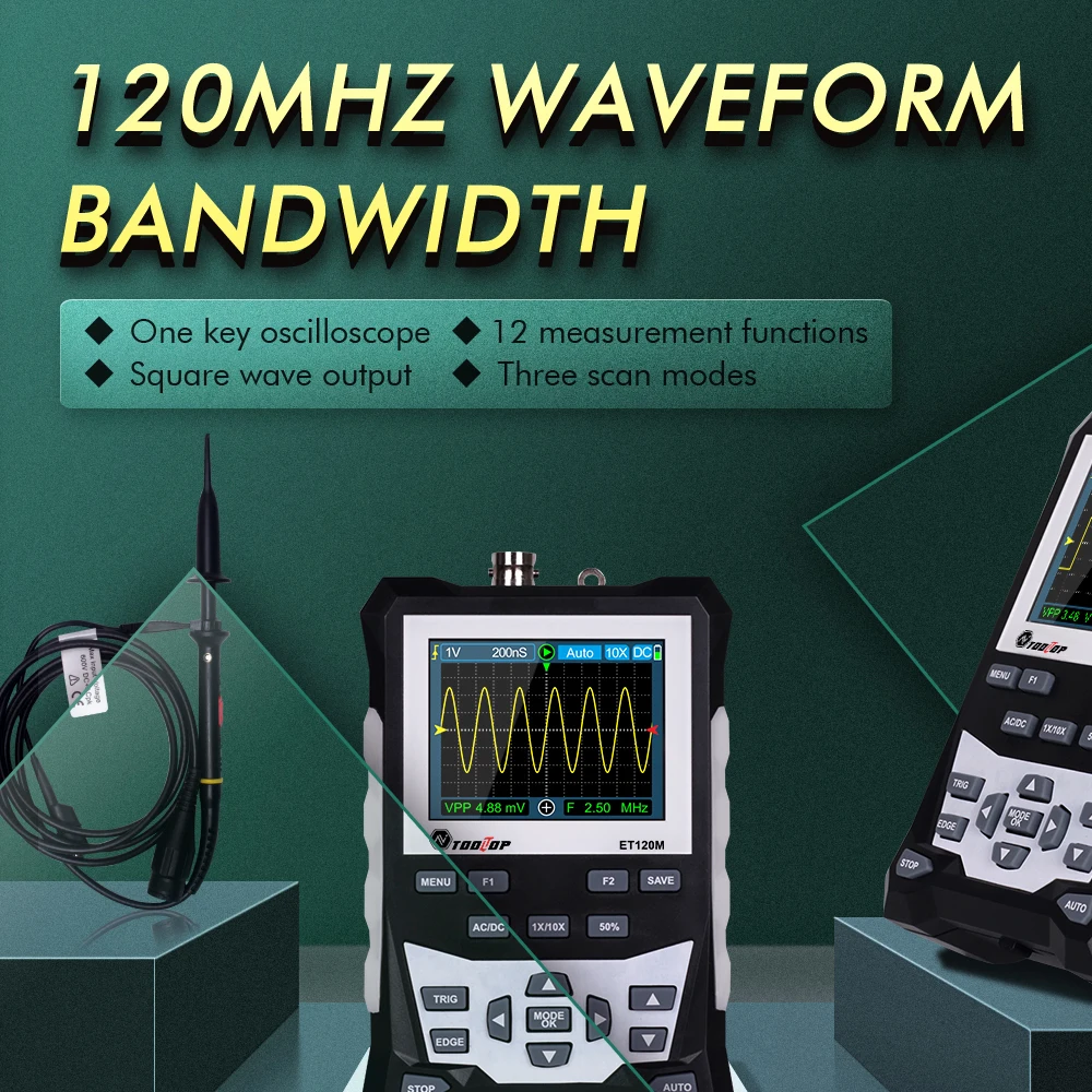 -Ancho de banda analógico de 120MHz y frecuencia de muestreo de 500 MS/sOsciloscopio con 2,4 pulgadas 320*240 pantalla a color claro